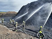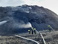 Patnáct jednotek požární ochrany zasahuje na skládce v Růžodolu u Litvínova u požáru hromady štěpky o půdorysu přibližně 20 × 50 metrů. Hasiči prolévají hromadu vodou.