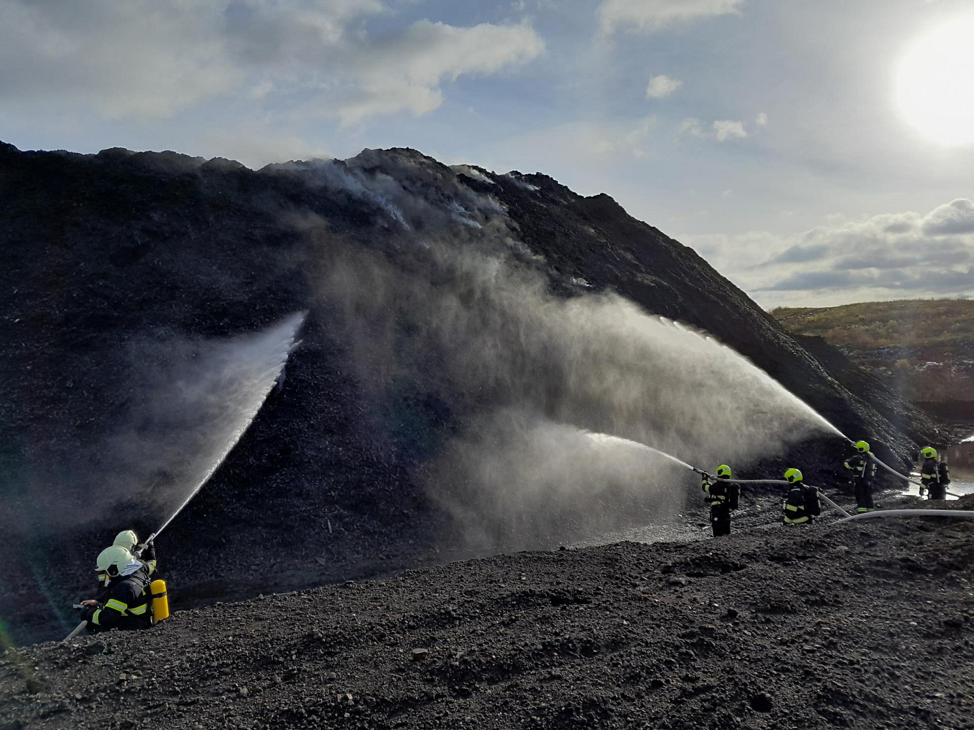 Patnáct jednotek požární ochrany zasahuje na skládce v Růžodolu u Litvínova u požáru hromady štěpky o půdorysu přibližně 20 × 50 metrů. Hasiči prolévají hromadu vodou.