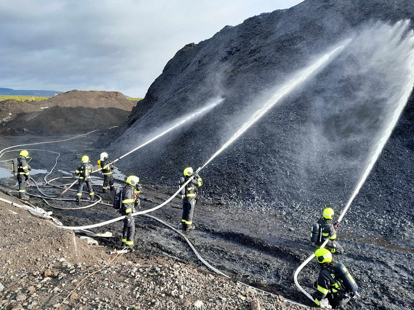 Požár štěpky v Růžodolu u Litvínova, třetí stupeň poplachu. Hasiči zřídili čerpací stanoviště