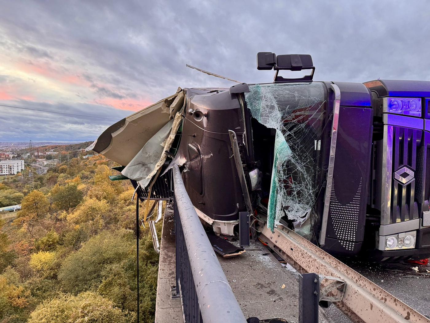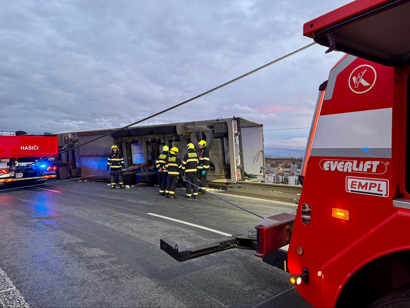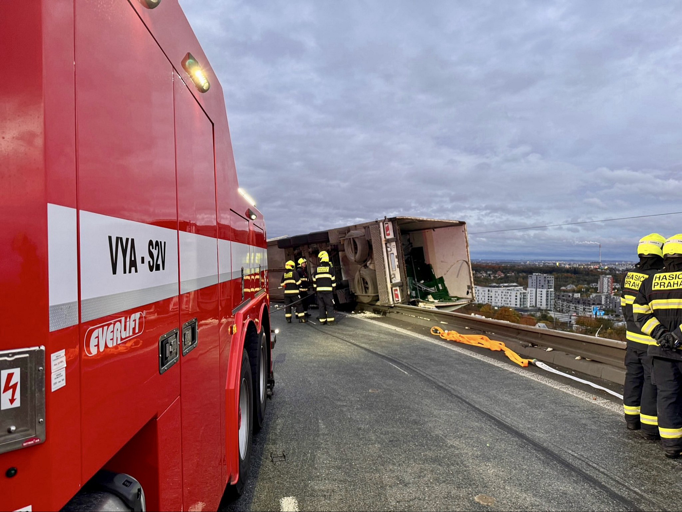 Jednotky ze tří pražských stanic zasahují na ulici Kbelská u dopravní nehody kamionu, který se převrátil na bok. Vozidlo prorazilo ochranné zábradlí a částí vozidla je mimo komunikaci. Hasiči řeší únik provozních kapalin a vozidlo zajistili.
