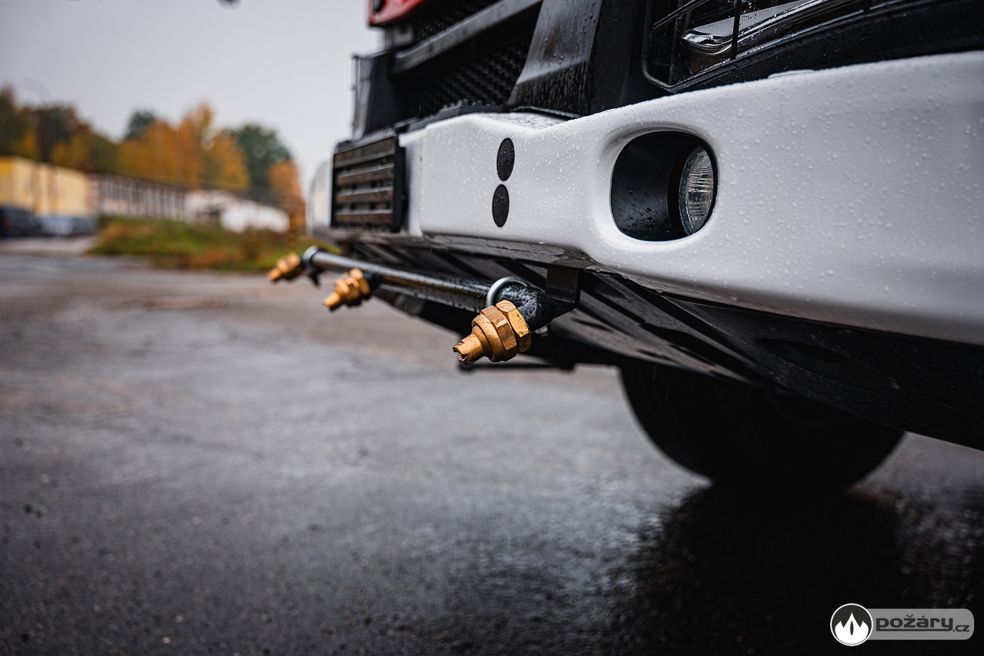 Naviják se dopředu nevešel – nedovolila ho kombinace prodloužené kabiny a vnitřních rozměrů hasičské zbrojnice. Přední nárazník tak na své spodní části poskytuje prostor jen pro asanační lištu.