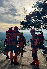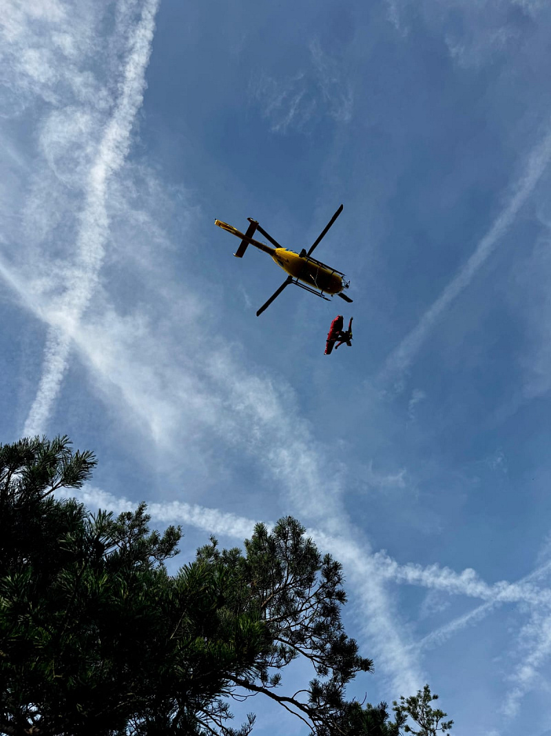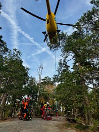 Zraněného turistu nejprve hasiči vyprostili z pětimetrové hloubky, pak ho v podvěsu transportovali vrtulníkem k sanitnímu vozu