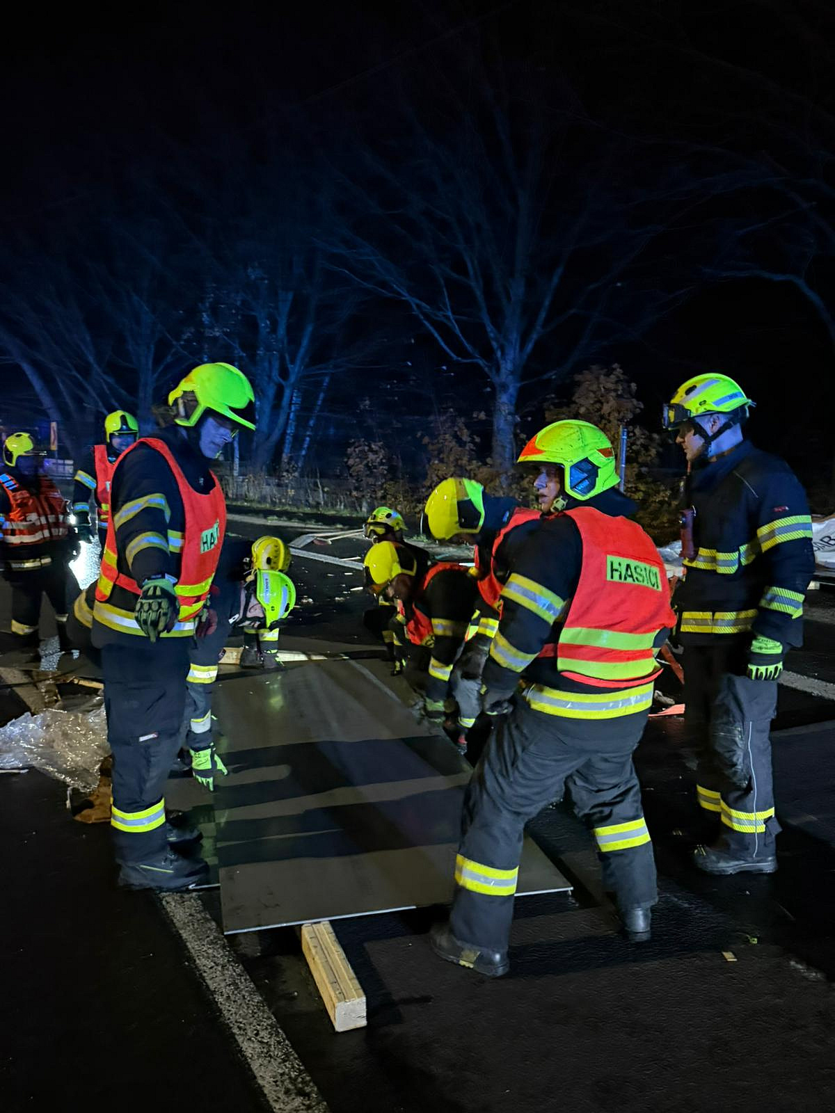 Hasiči plechy (váha přibližně 300 kg/ks) a ostatní převážený materiál umístili na hromadu mimo komunikaci, kterou označili vytyčovací páskou. Na místě zasahovali profesionální hasiči ze stanice Děčín společně s jednotkami SDH obcí Jílové a Libouchec.