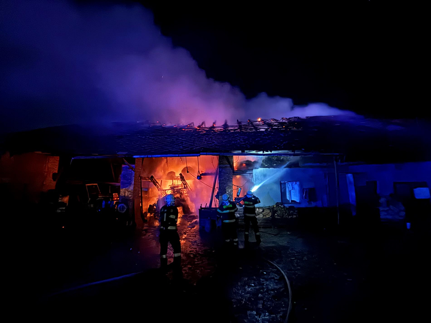 Požár stodoly se zemědělskou technikou likvidovali hasiči v obci Mečeříž