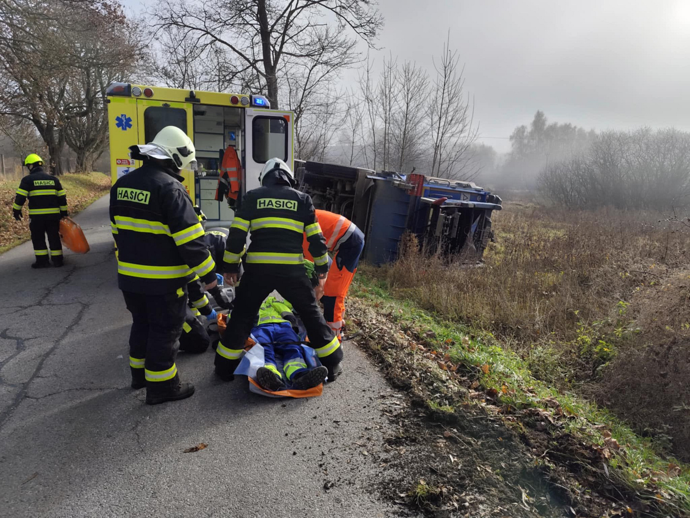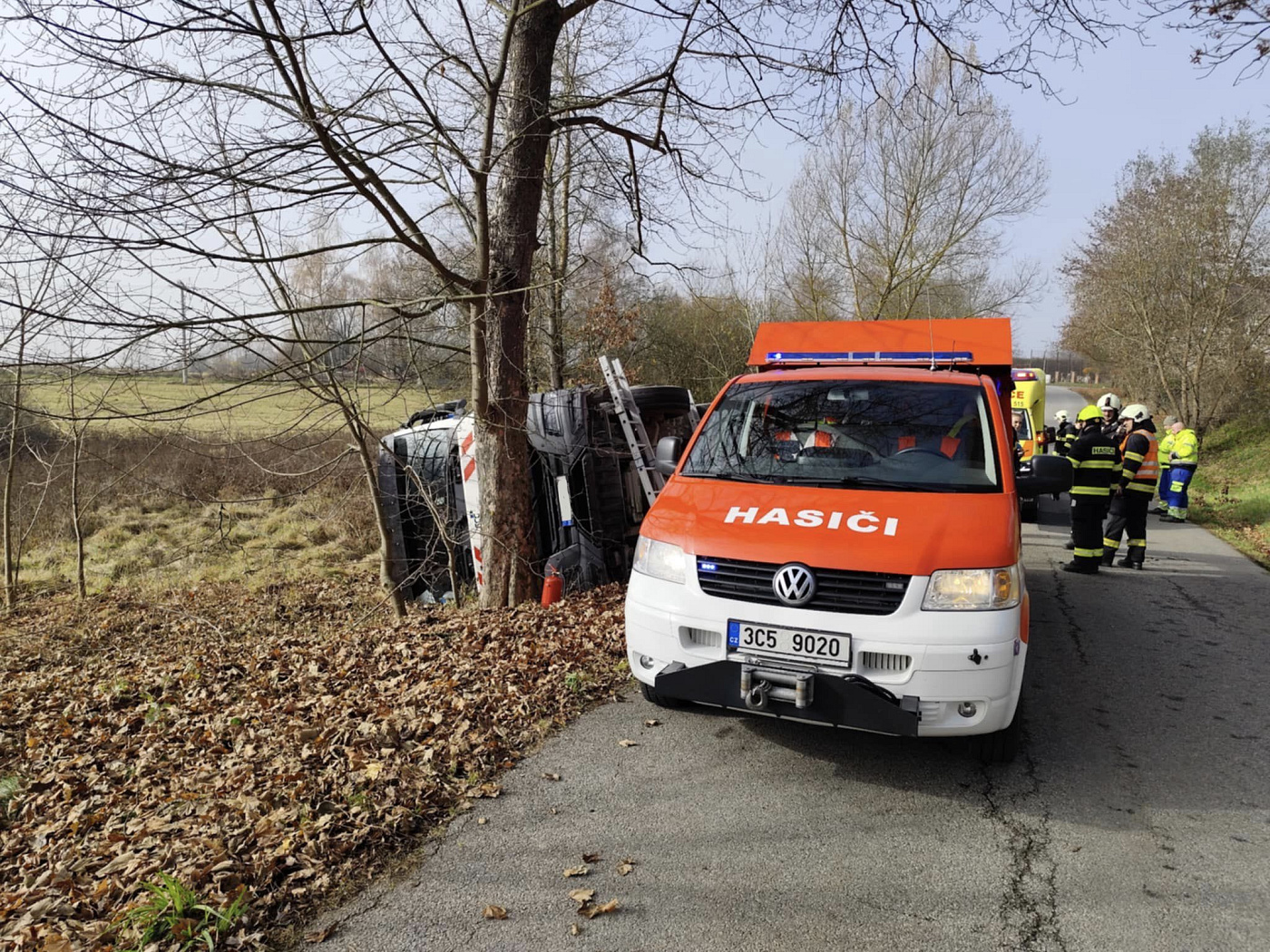 U Horního Dvořiště se převrátilo popelářské vozidlo mimo komunikaci, dvě zraněné osoby skončily v nemocnici