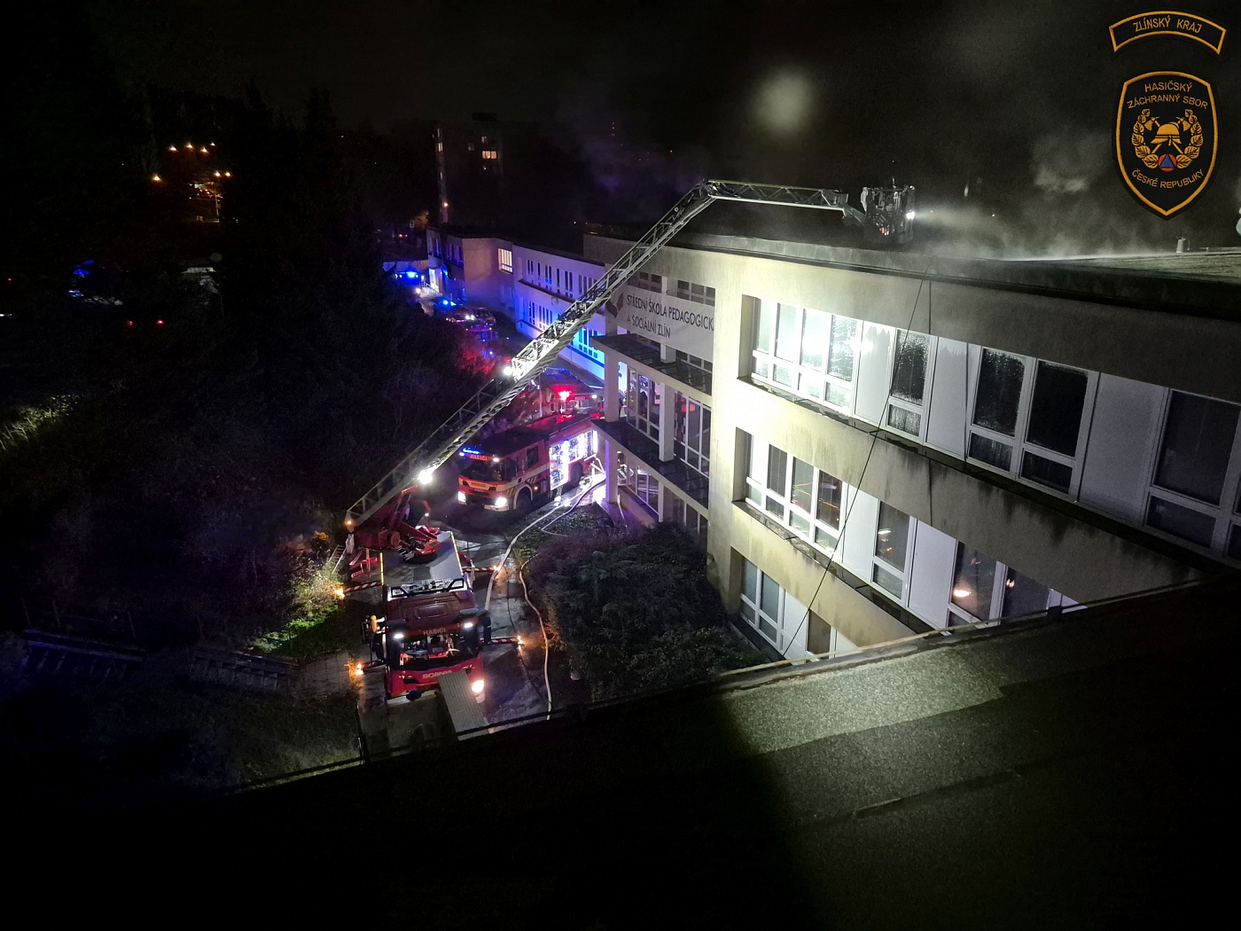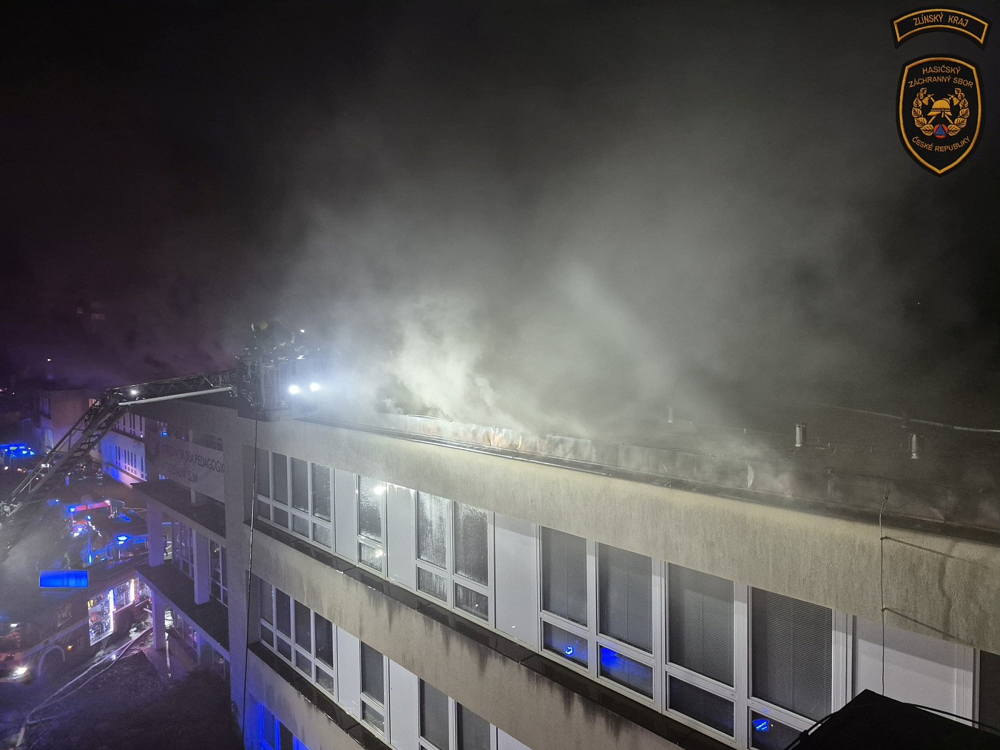 Krátce po páté hodině odpolední byl na krajské operační středisko hasičů oznámen požár střechy střední školy v ulici Česká ve Zlíně. Na místo postupně bylo vysláno jedenáct jednotek profesionálních a dobrovolných hasičů. Byl tak vyhlášen třetí stupeň požárního poplachu.