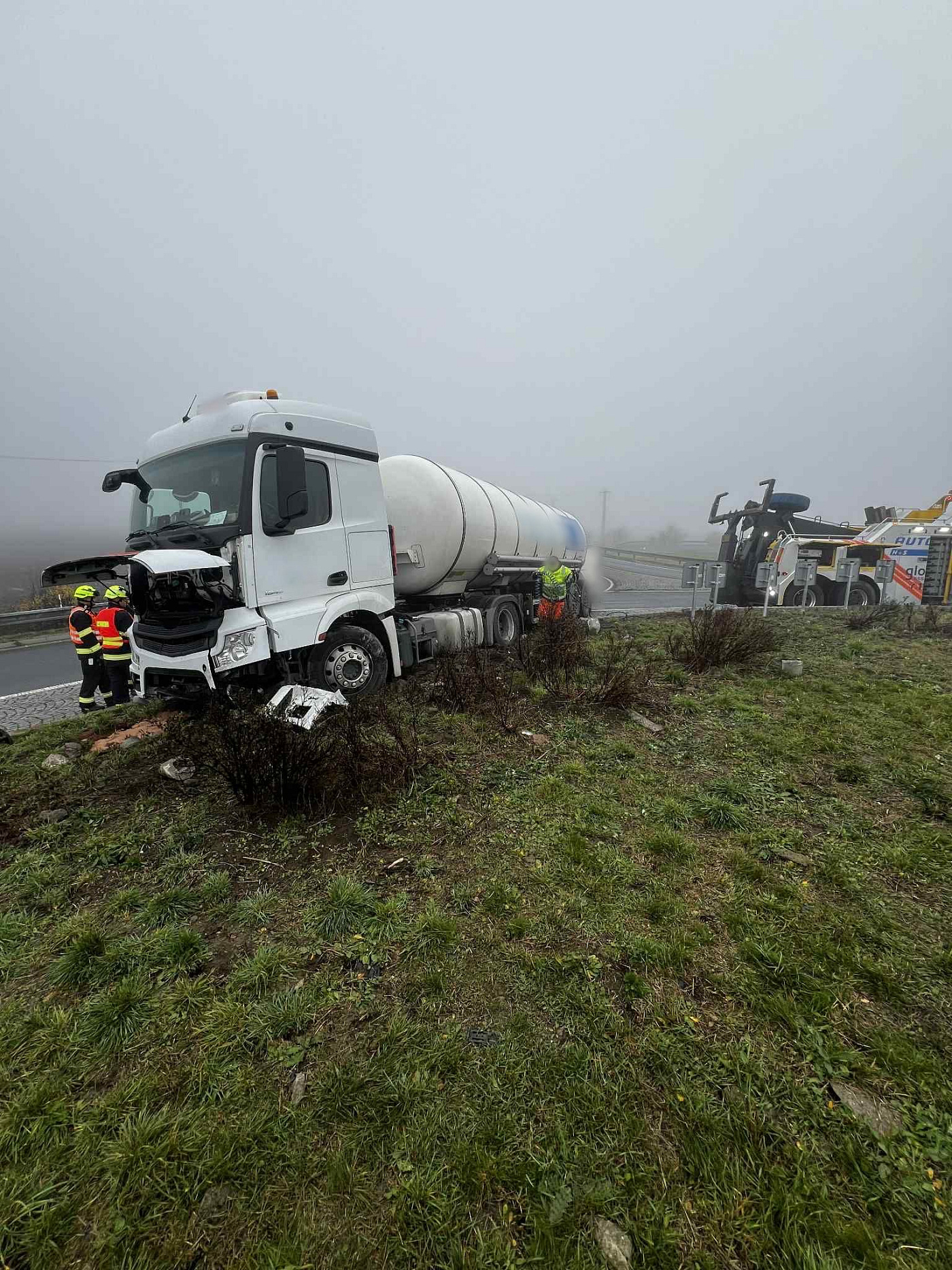 Na hlavním tahu mezi Mostem a Plzní došlo k havárii nákladního automobilu. Naštěstí se nehoda obešla bez zranění.