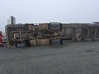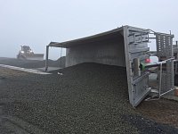 Automobil se na stavbě nové komunikace při práci převrátil na bok. Při příjezdu jednotek na místo již záchranáři muže uvnitř kabiny ošetřovali.
