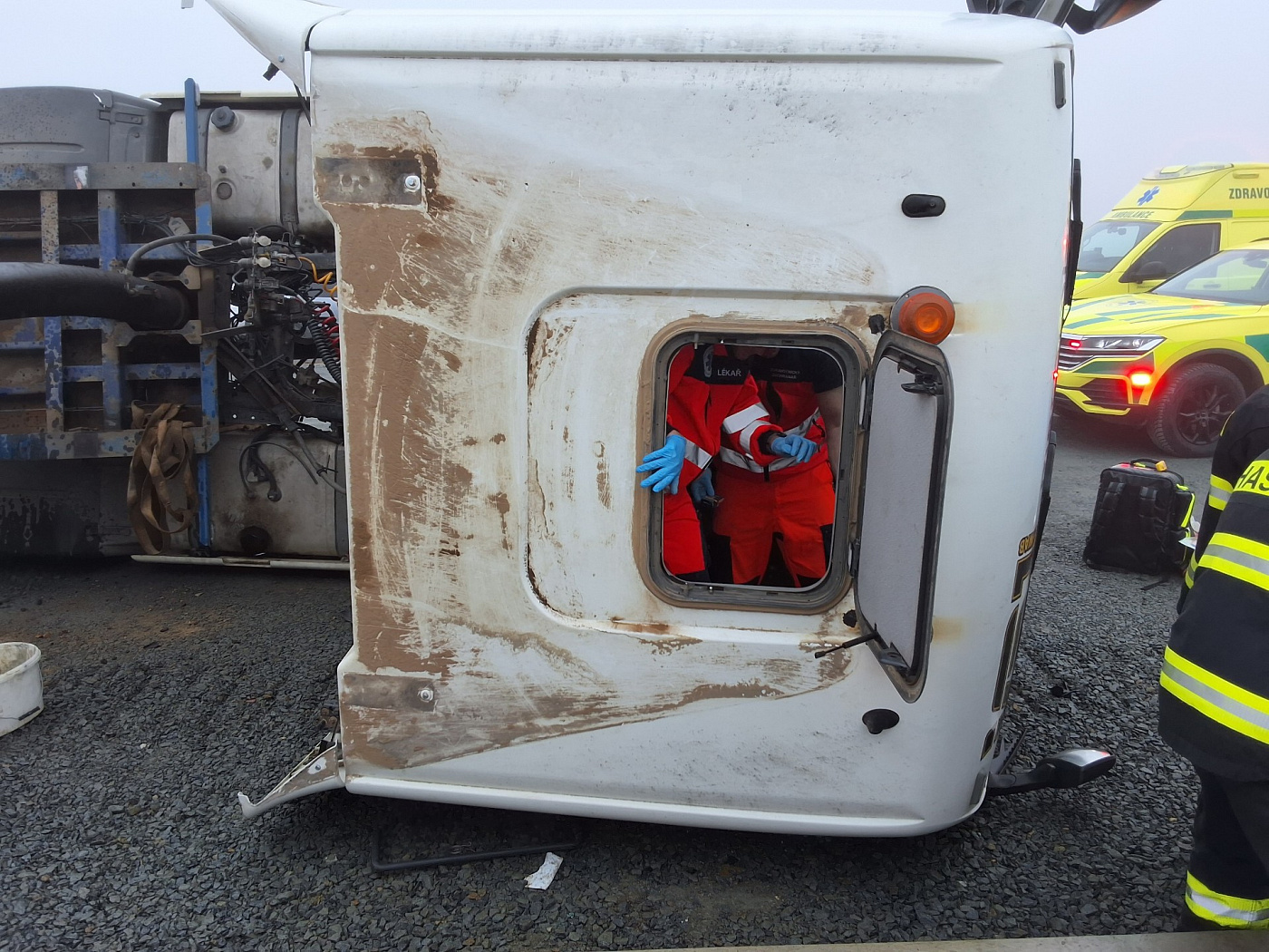 Automobil se na stavbě nové komunikace při práci převrátil na bok. Při příjezdu jednotek na místo již záchranáři muže uvnitř kabiny ošetřovali.