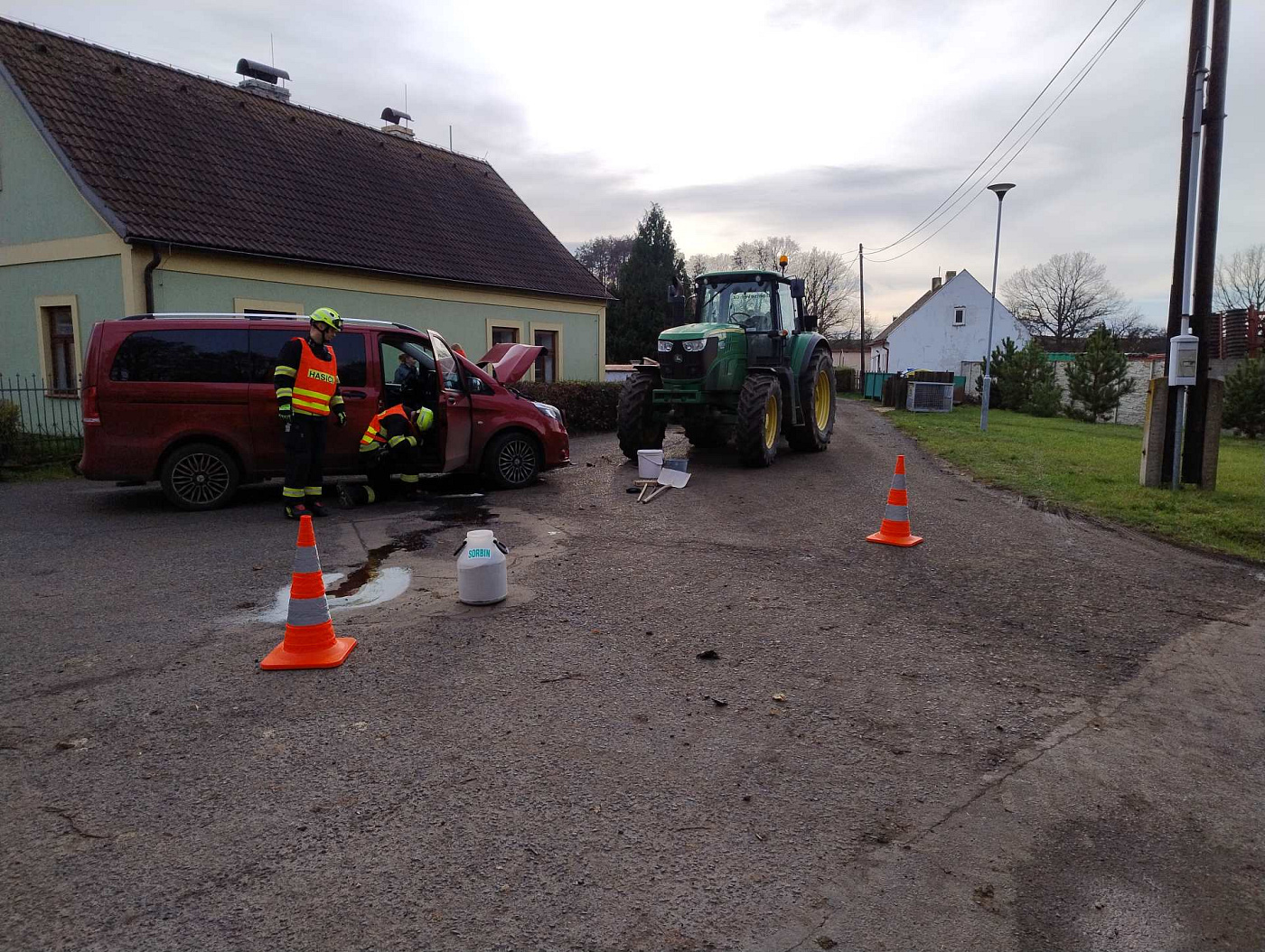 V Novém Sedle na Lounsku se srazil osobní automobil s traktorem. Nehoda je bez zranění. Hasiči likvidují uniklé provozní kapaliny.