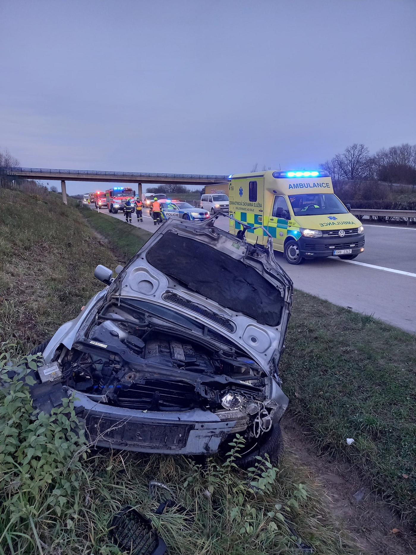Jednotky hasičů ze tří stanic zasahují na D11 v katastru Chlumce nad Cidlinou. Na dálnici havaroval osobní automobil. Událost je bez zranění.