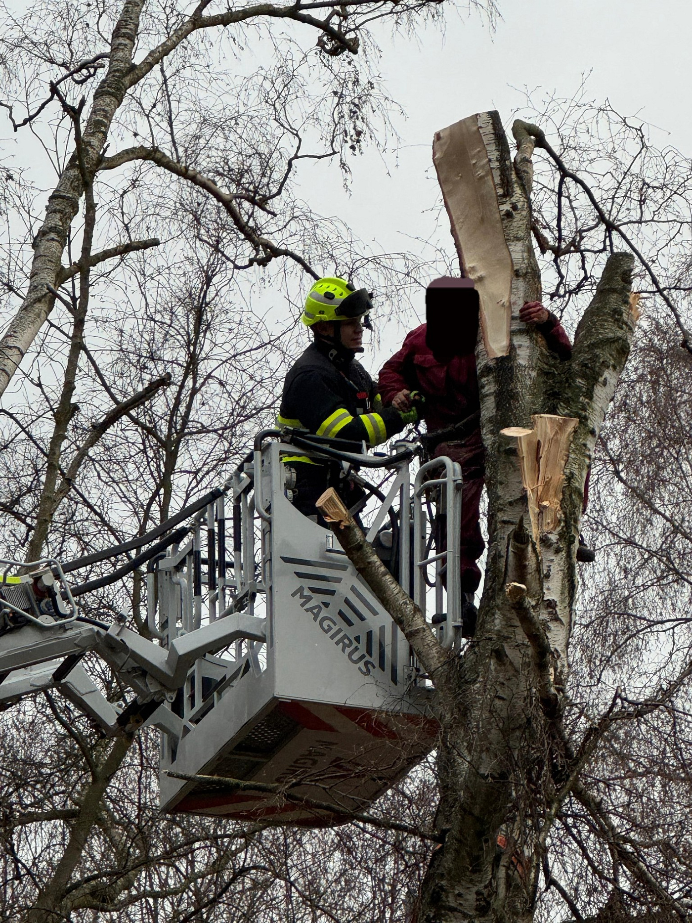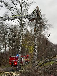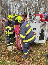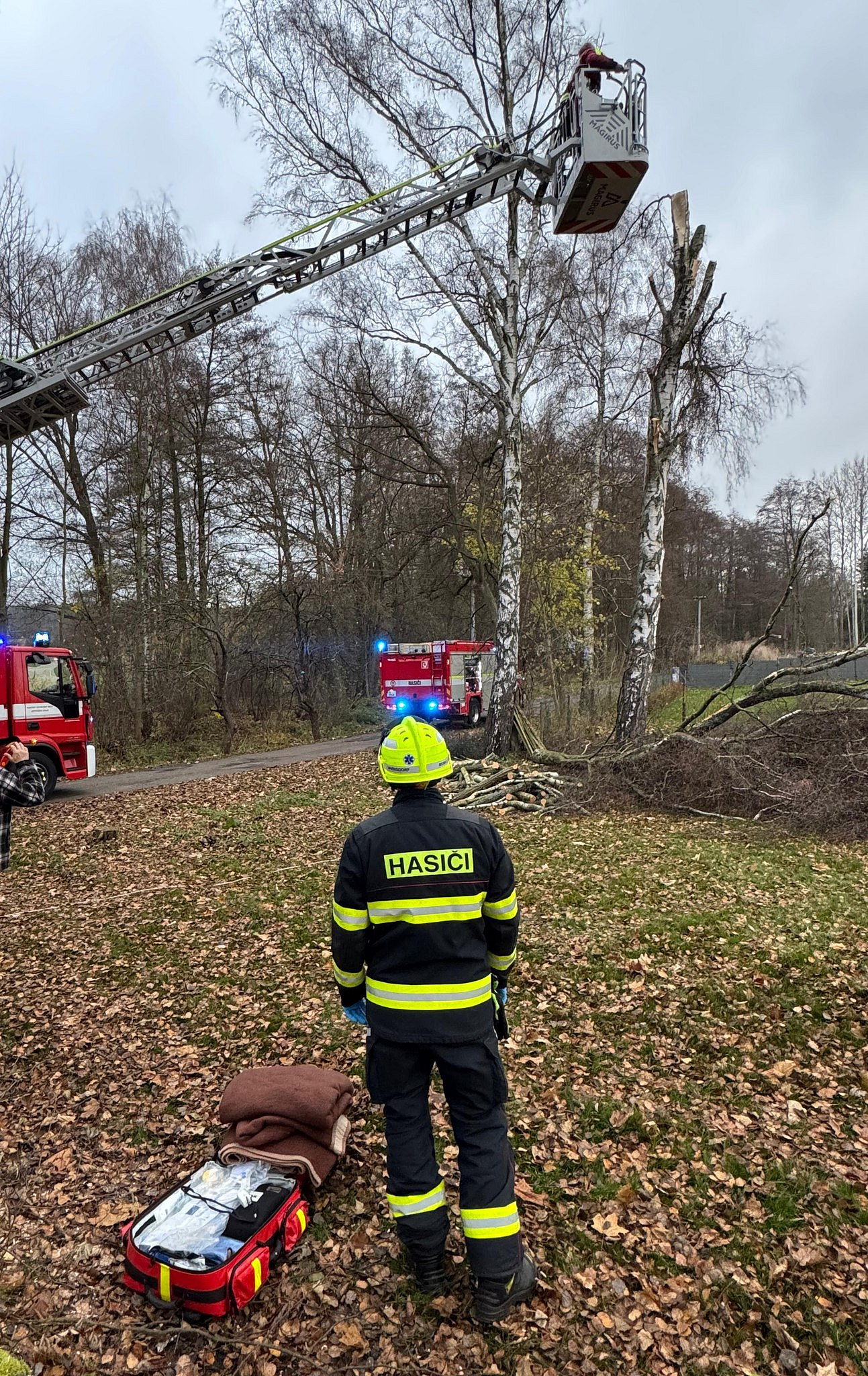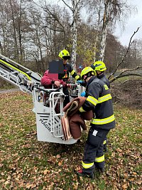 Profesionální hasiči ve Varnsdorfu zachraňovali pomocí automobilového žebříku zraněného muže ze stromu
