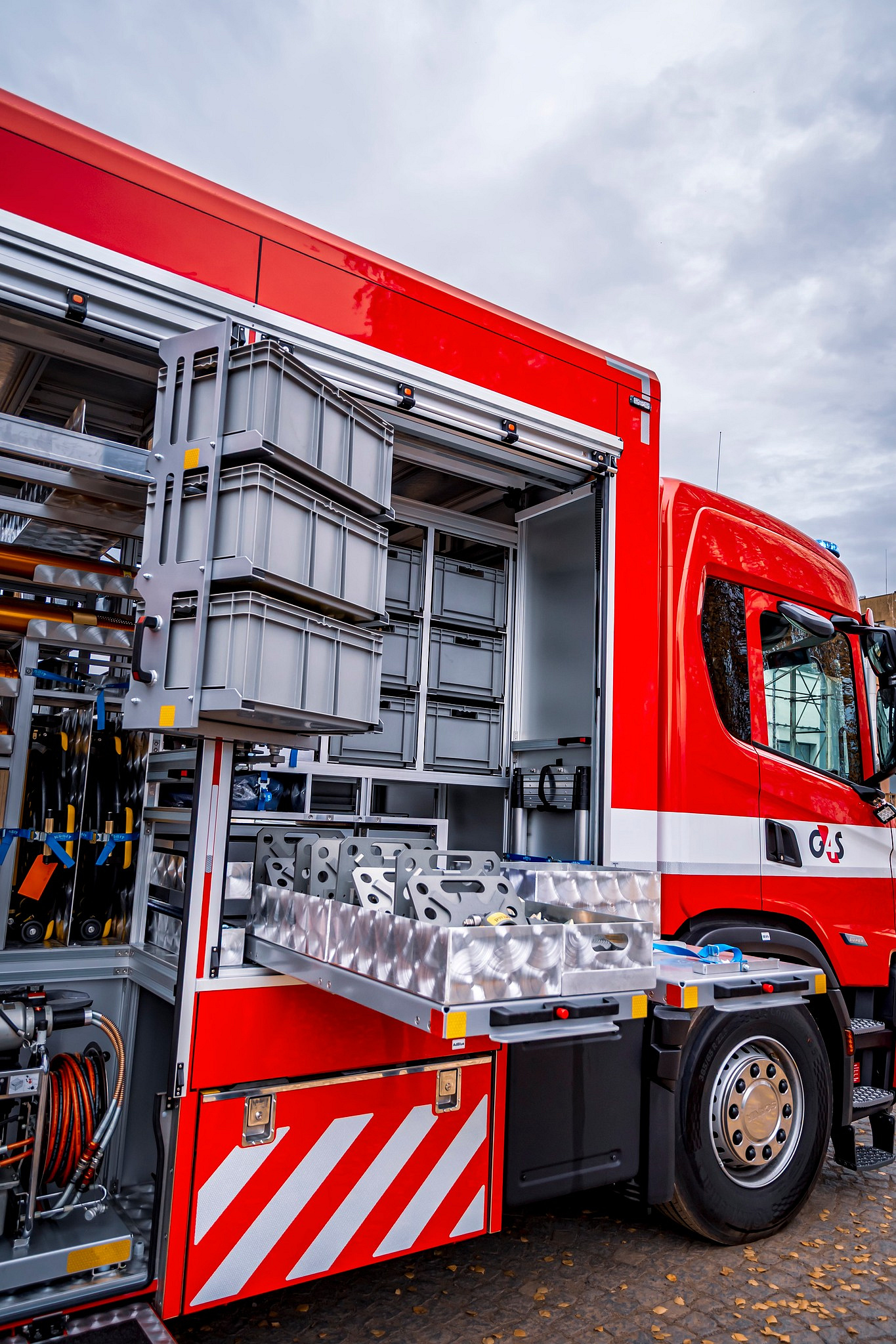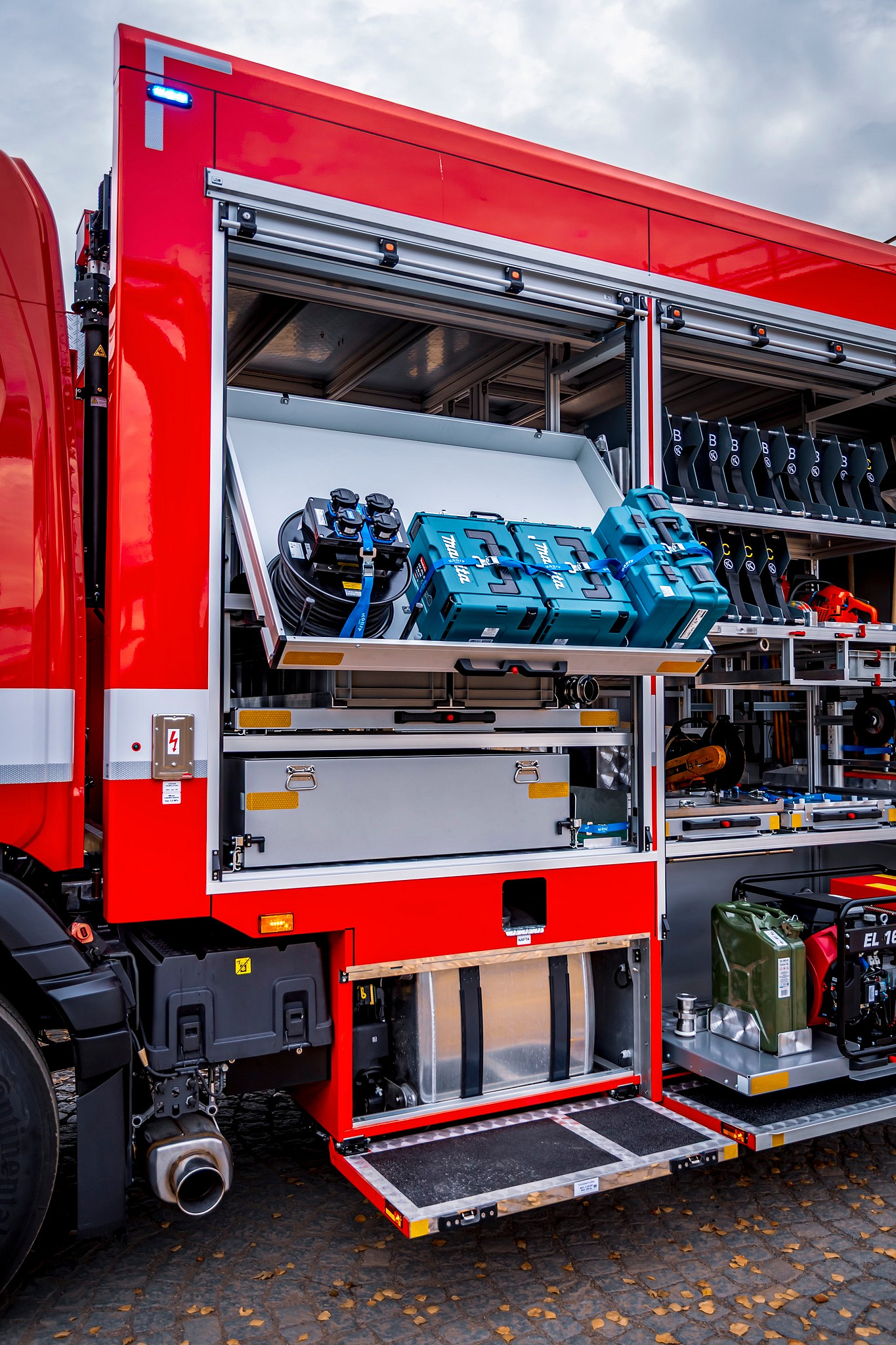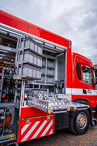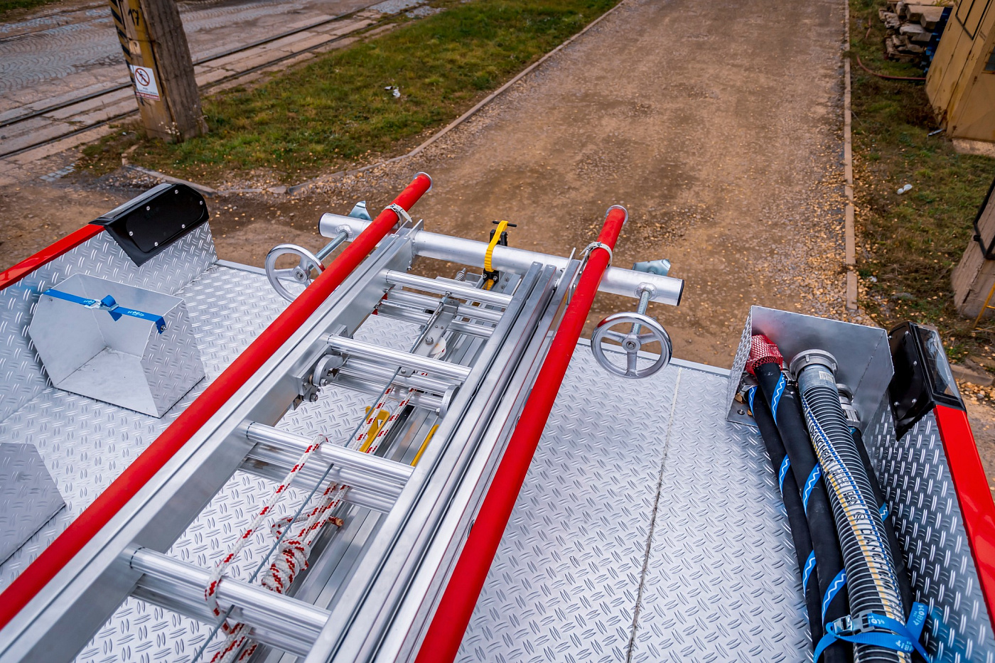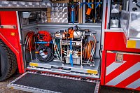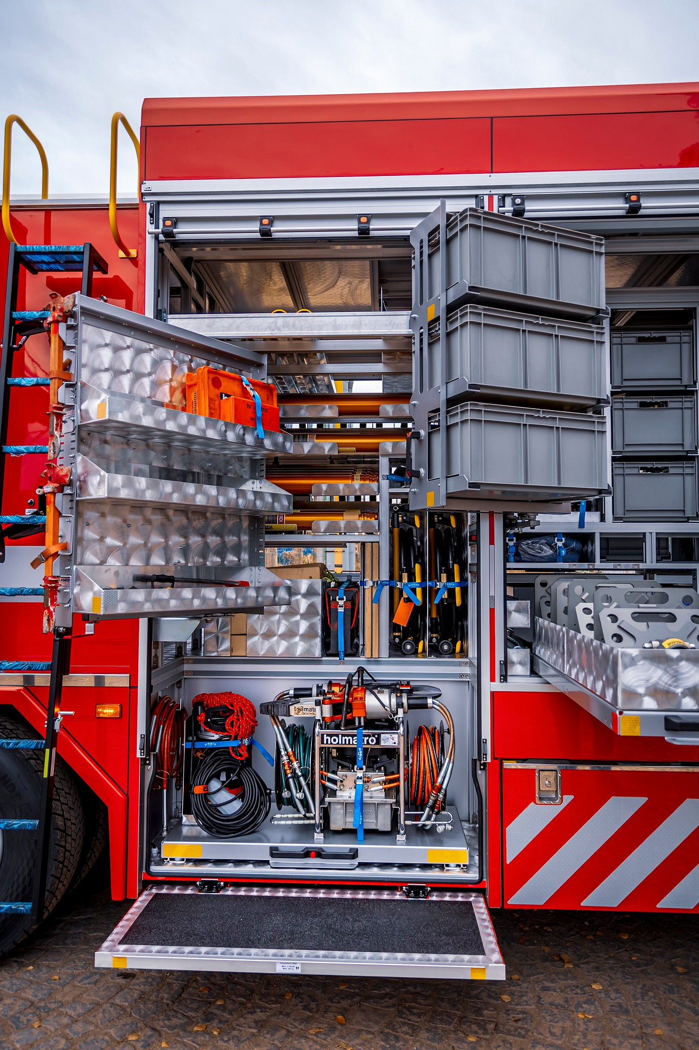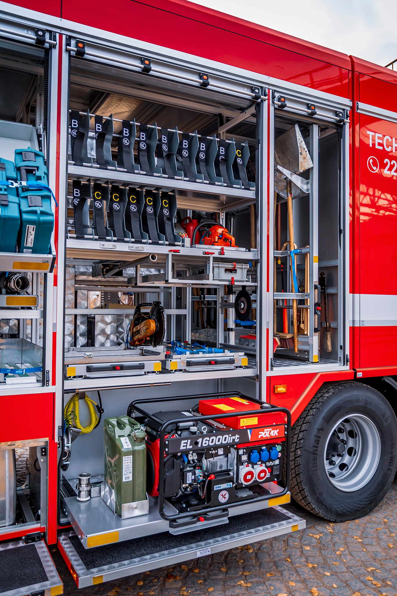 Vybavení je ve schránách uloženo na výsuvných a výklopných prvcích, nechybí motorové pily, ženijní nářadí, hadice ani elektrocentrála s příslušenstvím. V automobilu najdeme i hydraulickou vyprošťovací sadu a stabilizační prostředky.