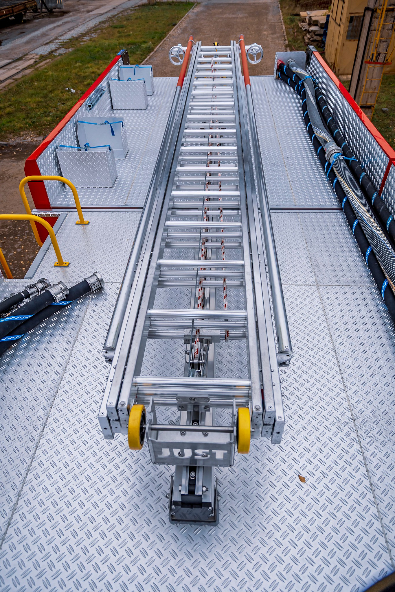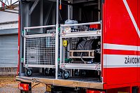 Na jednom z vozíčků je uloženo hasicí a řezací zařízení Cobra s příslušenstvím, včetně hadicového navijáku a abraziva.
