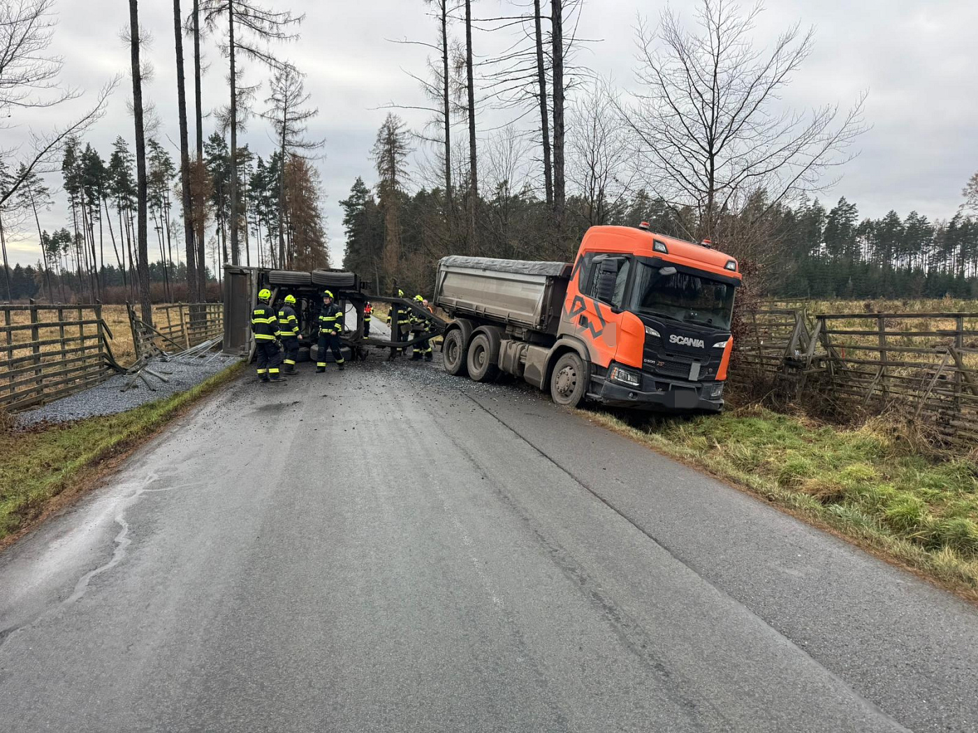 Krátce před polednem vyjeli hasiči do Lán k nehodě nákladního automobilu, při které došlo k převržení vleku, vysypání nákladu (štěrku) na vozovku a zablokování silnice z Lán do Křivoklátu. Událost se obešla bez zranění.