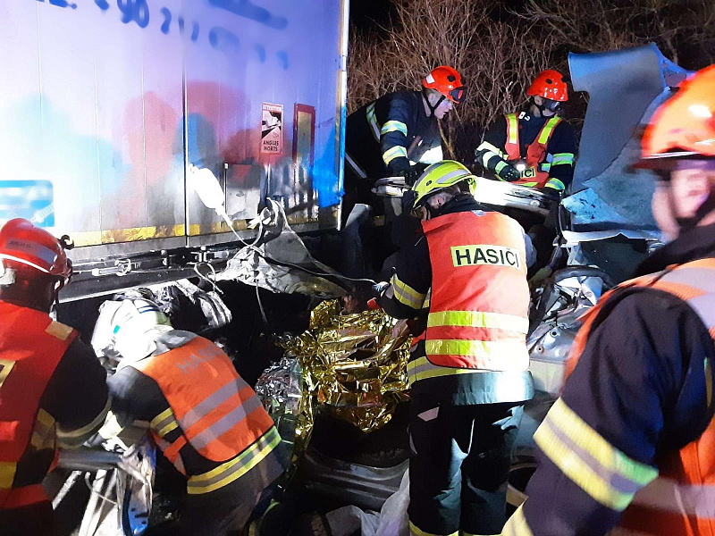 Po nehodě zůstal osobní vůz zaklíněný pod návěsem kamionu. Uvnitř cestovali dva lidé, které bylo potřeba vyprostit.