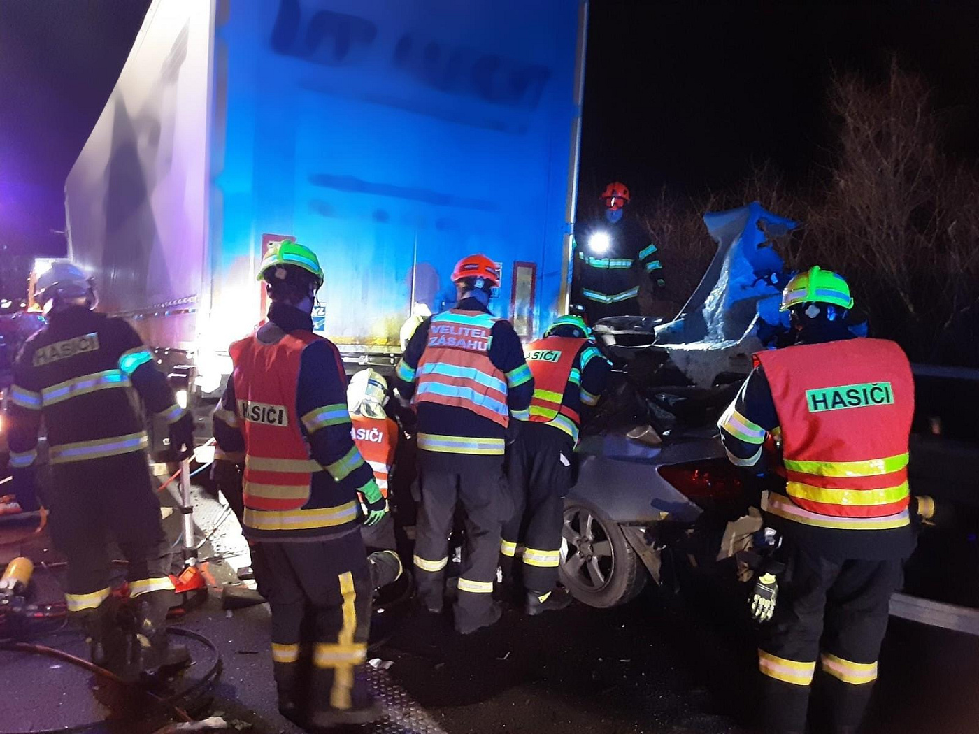 Po nehodě zůstal osobní vůz zaklíněný pod návěsem kamionu. Uvnitř cestovali dva lidé, které bylo potřeba vyprostit.