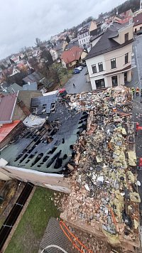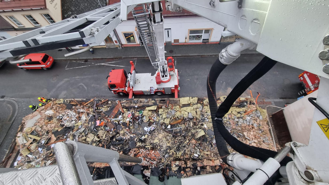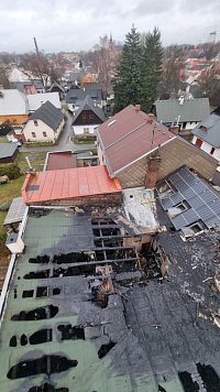 Náročný požár střechy zaměstnal hasiče v centru Hlinska. Zasahovalo 8 jednotek