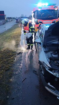 Nehoda dvou vozů komplikovala po 7. hodině provoz na silnici I/3 v Plané. Při nehodě utrpěla zranění 1 osoba, nehoda je bez vyproštění. Profesionální jednotka z Českých Budějovic provedla u aut protipožární opatření a zasypala provozní látky. Po ukončení šetření PČR hasiči dokončili úklid.