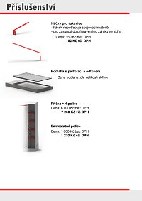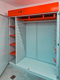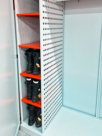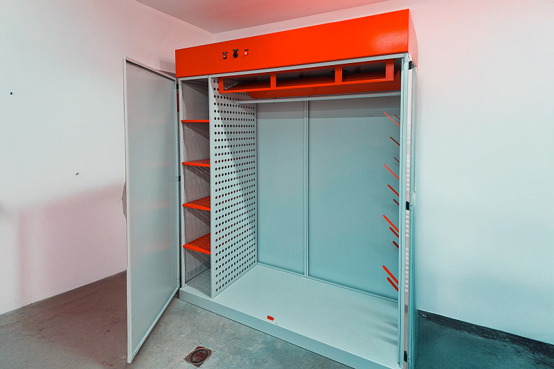 Skříně jsou standardně vybaveny 16 háčky na rukavice a tyčí pro zavěšení ramínek. Police lze posouvat v 10cm krocích, což umožňuje individuální přizpůsobení interiéru sušenému vybavení.