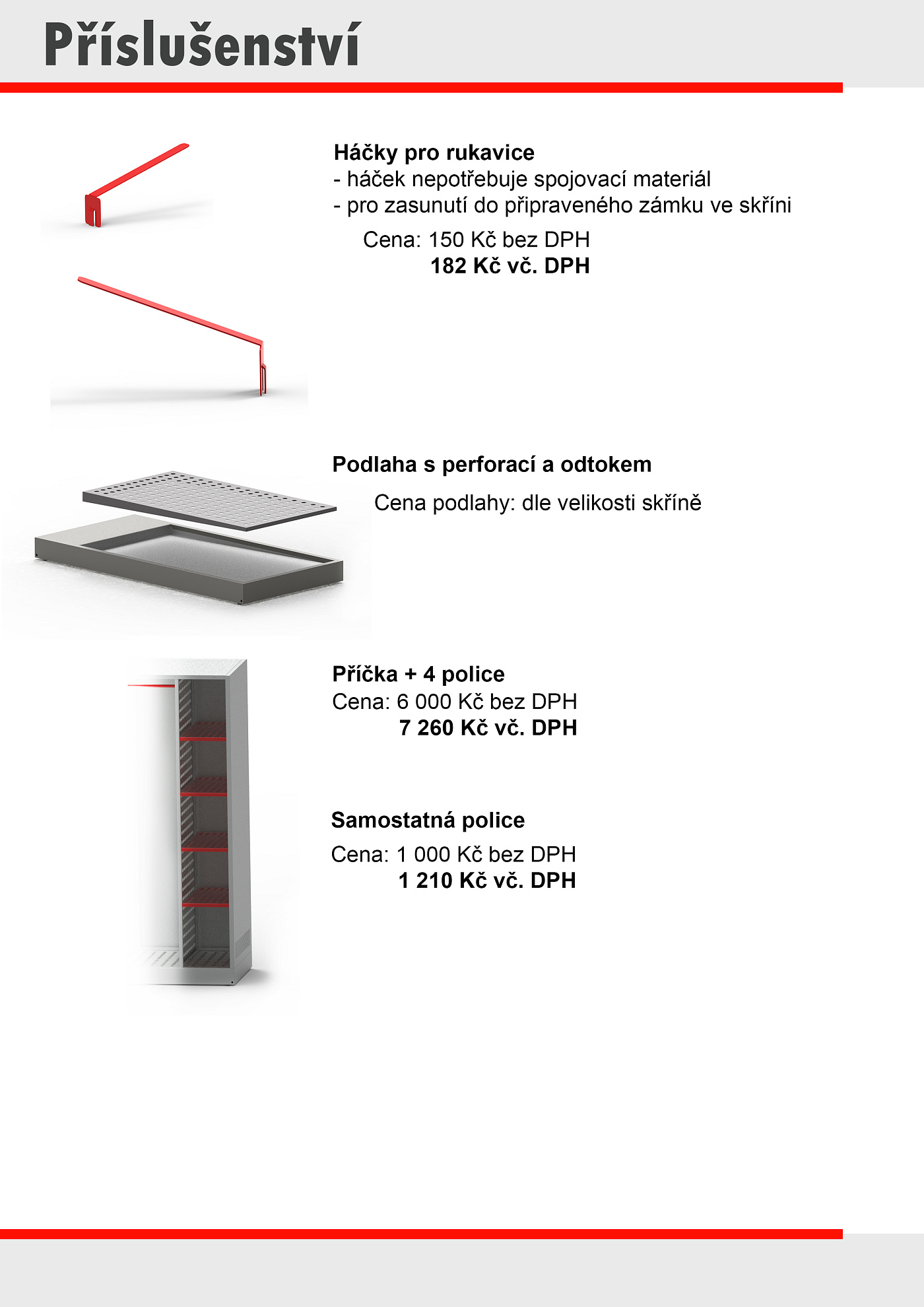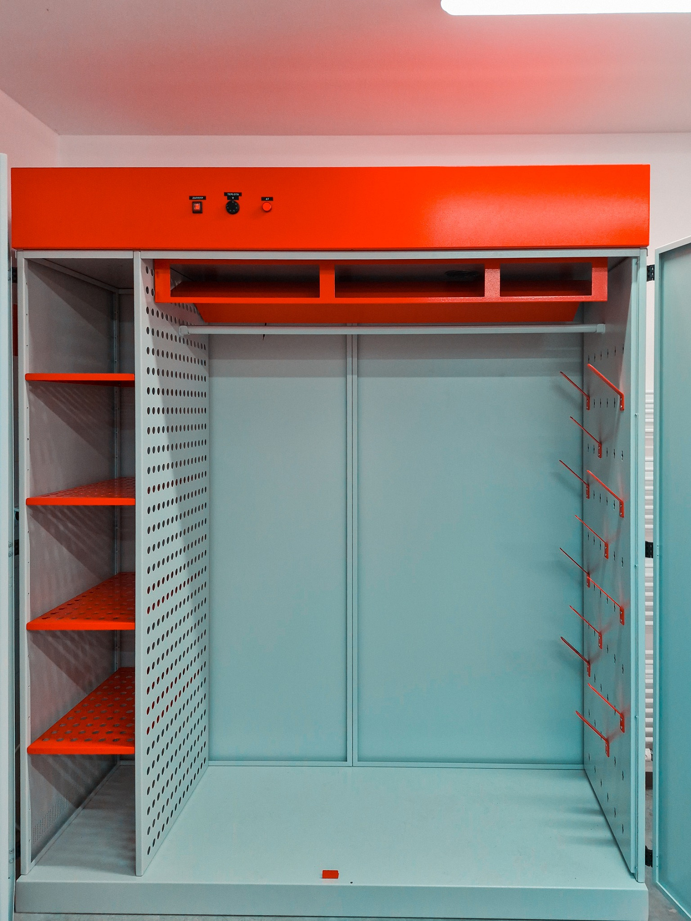 Skříně jsou standardně vybaveny 16 háčky na rukavice a tyčí pro zavěšení ramínek. Police lze posouvat v 10cm krocích, což umožňuje individuální přizpůsobení interiéru sušenému vybavení.