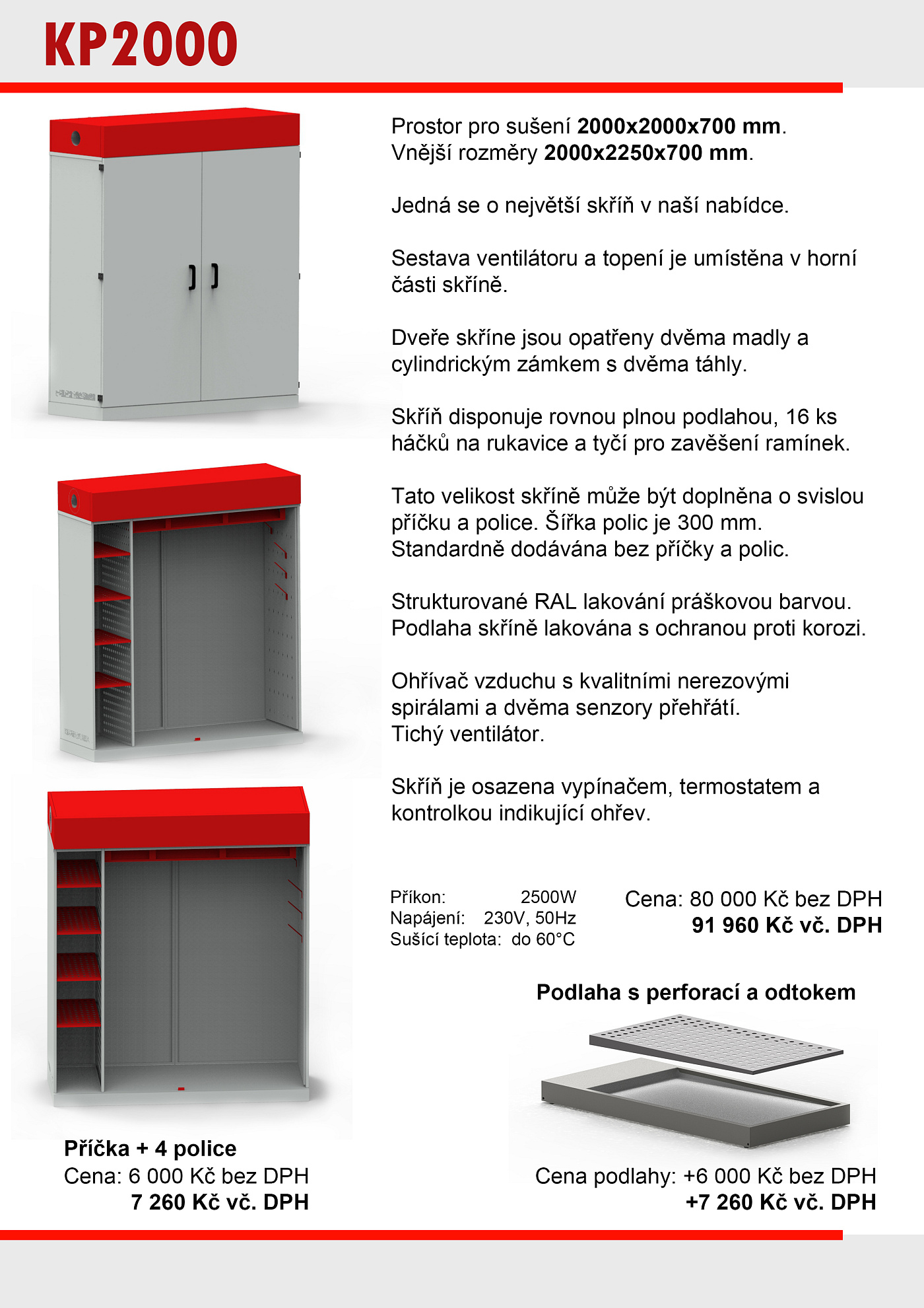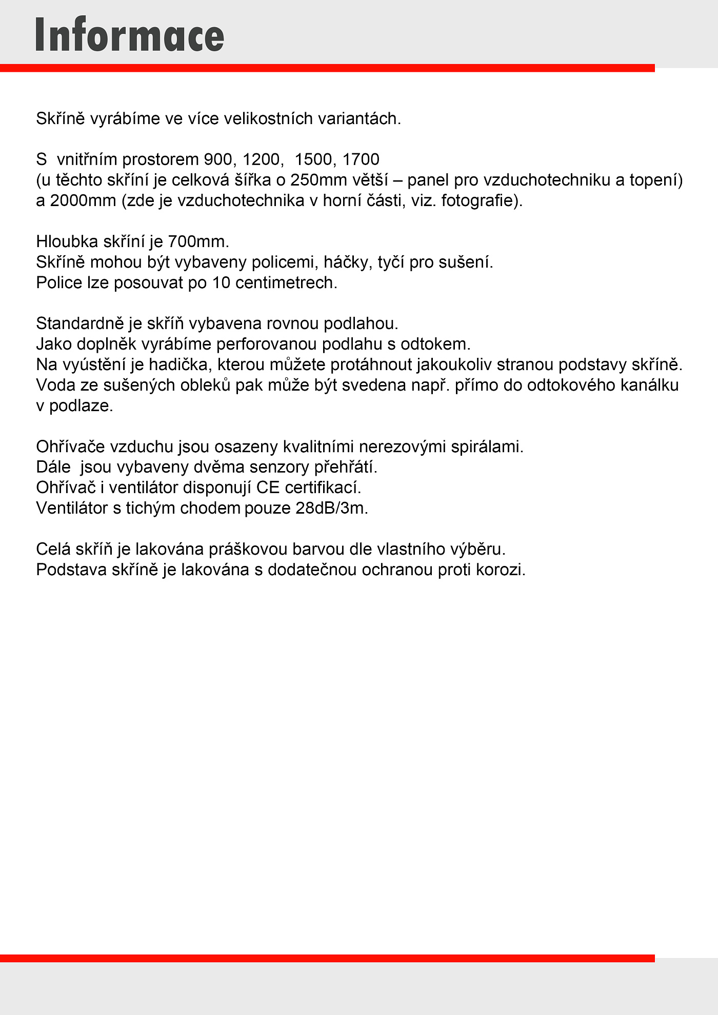 Nové modely spojují robustní konstrukci s moderními technologickými prvky. Skříně jsou osazeny ohřívači vzduchu s kvalitními nerezovými spirálami a dvěma senzory přehřátí, které zajišťují bezpečný a efektivní provoz. Příkon činí 2 500 W s napájením 230 V. Maximální sušicí teplota je nastavena do 60 °C.