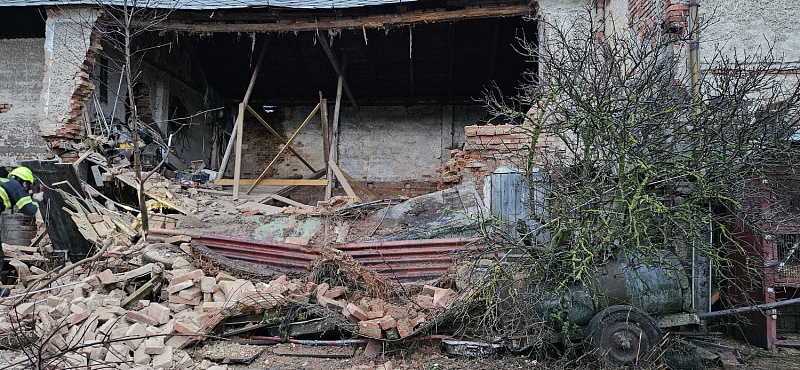 Zřítila se stěna hospodářského stavení v Těšeticích, jednu zraněnou osobu transportoval vrtulník