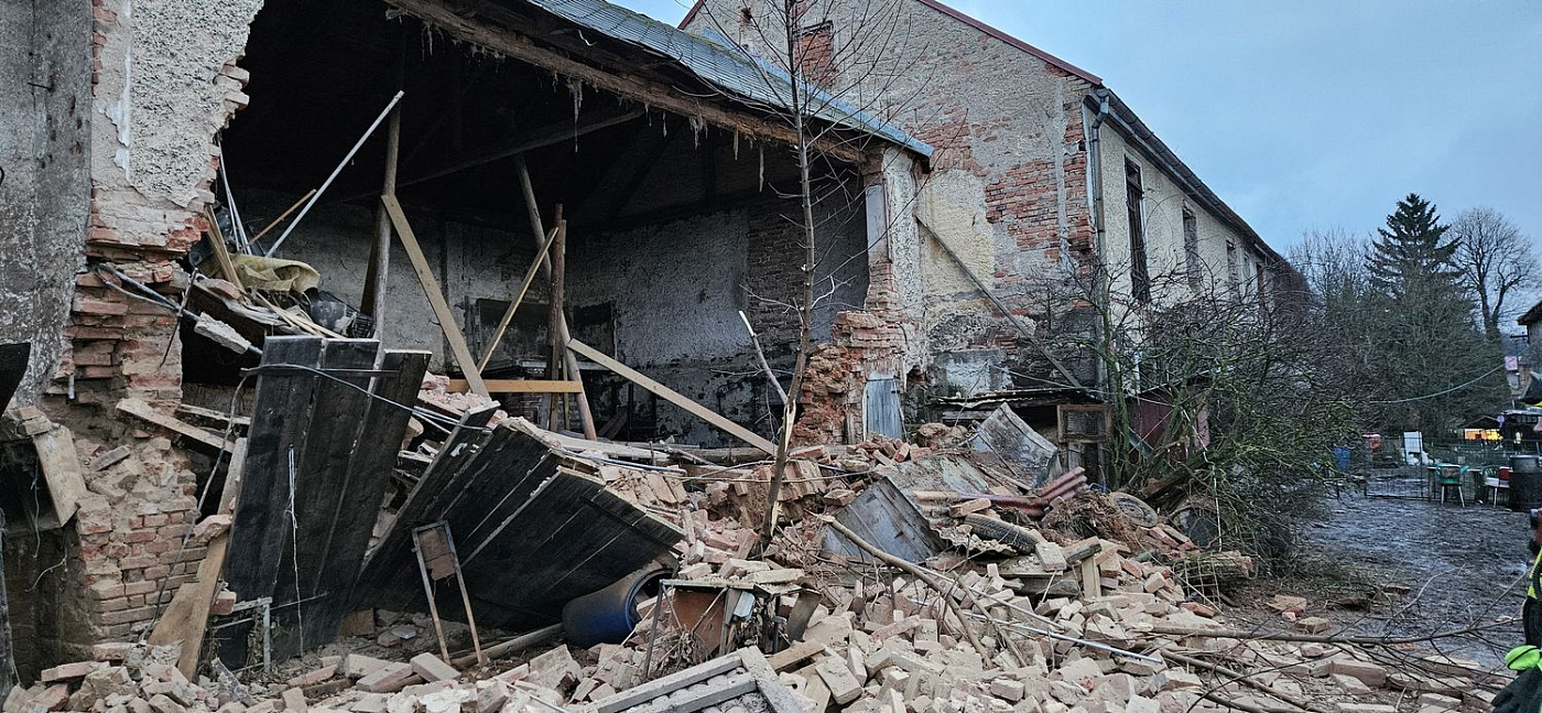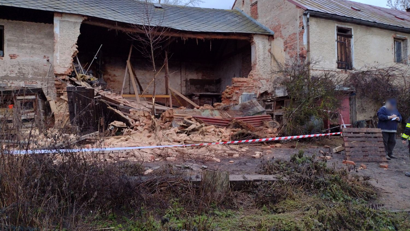 Zřítila se stěna hospodářského stavení v Těšeticích, jednu zraněnou osobu transportoval vrtulník