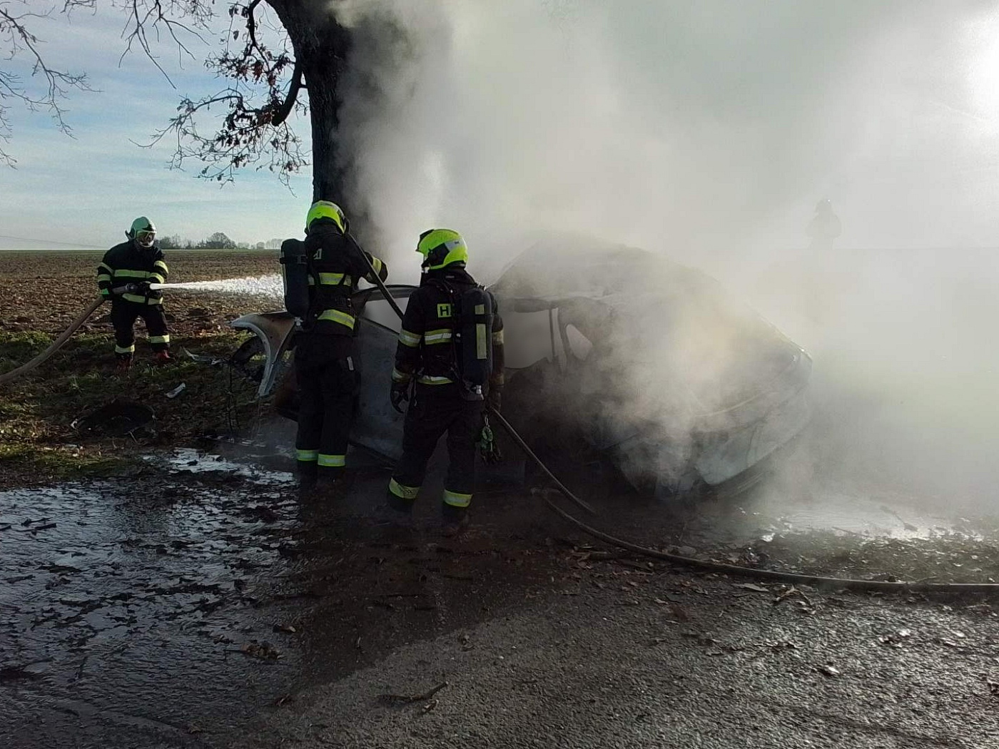 Tři jednotky požární ochrany likvidovaly krátce před půl dvanáctou požár hořícího osobního automobilu po nárazu do stromu na komunikaci č. 2691 u Střížovic na Litoměřicku.
