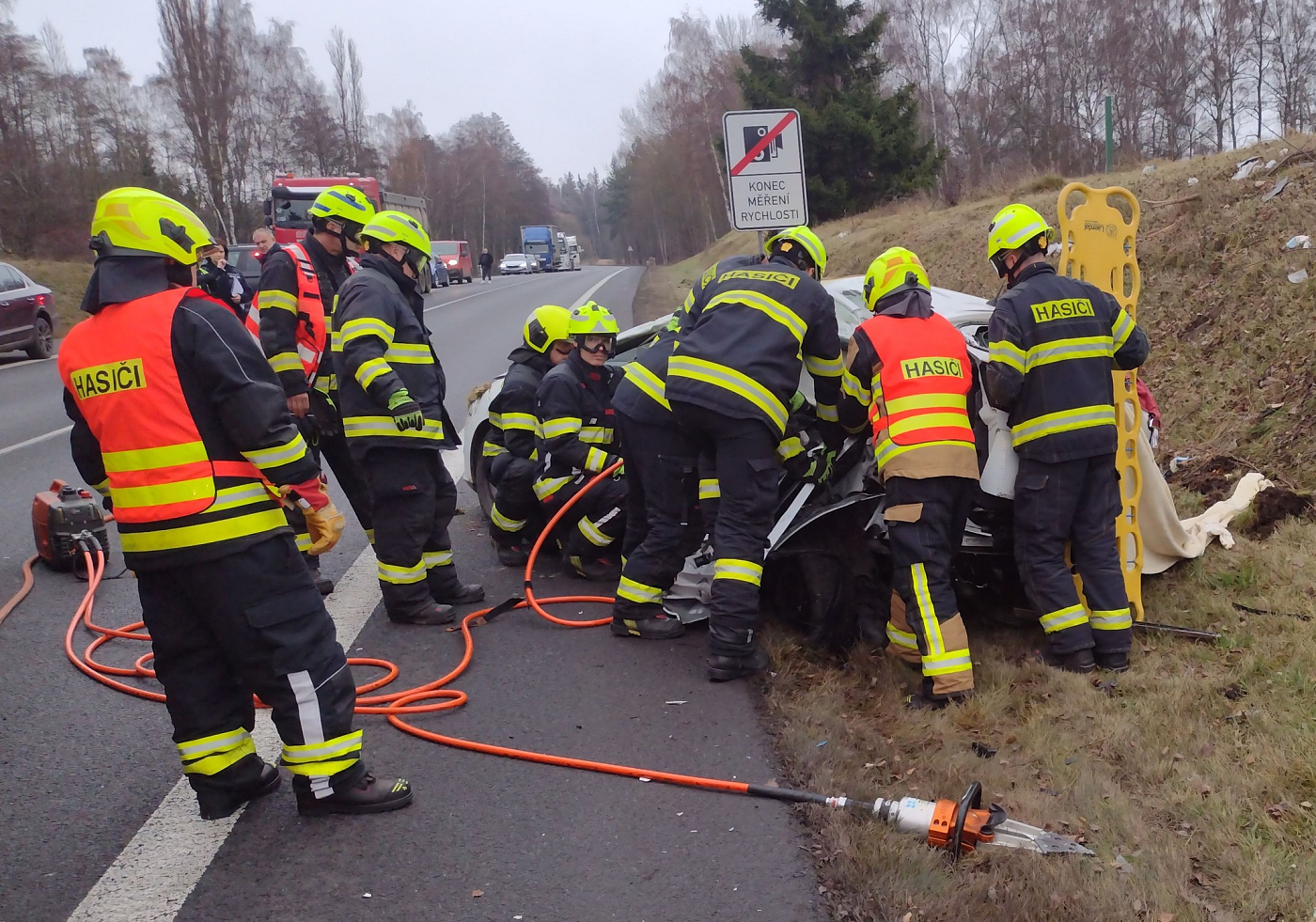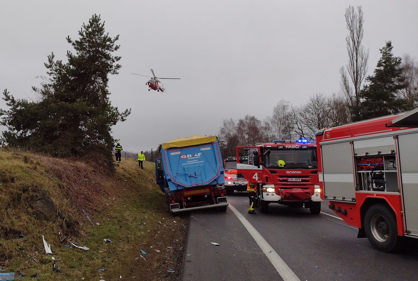 Od začátku záchranných prací byl provoz v místě nehody zcela uzavřený. Po odletu vrtulníku se s opatrností nechaly projet kamiony ze stojící kolony v obou směrech, poté se provoz opět uzavřel a to až do vyšetření nehody a úklidu vozovky. Na místě zasahují čtyři jednotky hasičů.