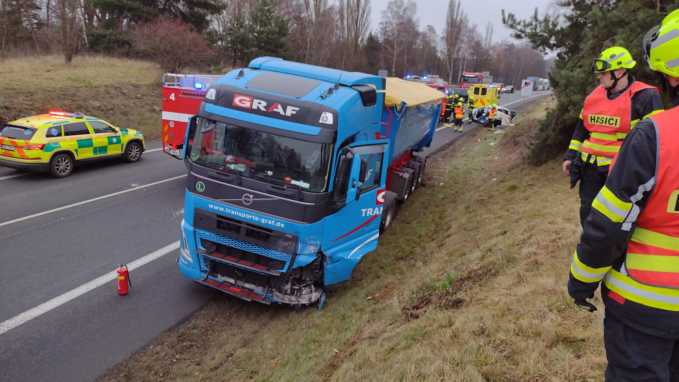 Po střetu osobního vozidla a kamionu na silnici I/6 museli hasiči vyprostit jednu osobu
