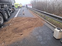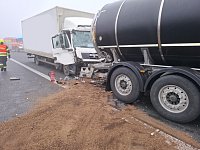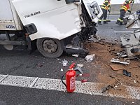 Hasiči zasahují u nehody dvou nákladních aut na D1 u Lipníku n.B. na 301,5 km. Po střetu zůstal v jednom vozidle zaklíněn zraněný řidič, ze zdeformované kabiny jej dostali pomocí vyprošťovacích nástrojů. Předali jej do péče záchranářům.