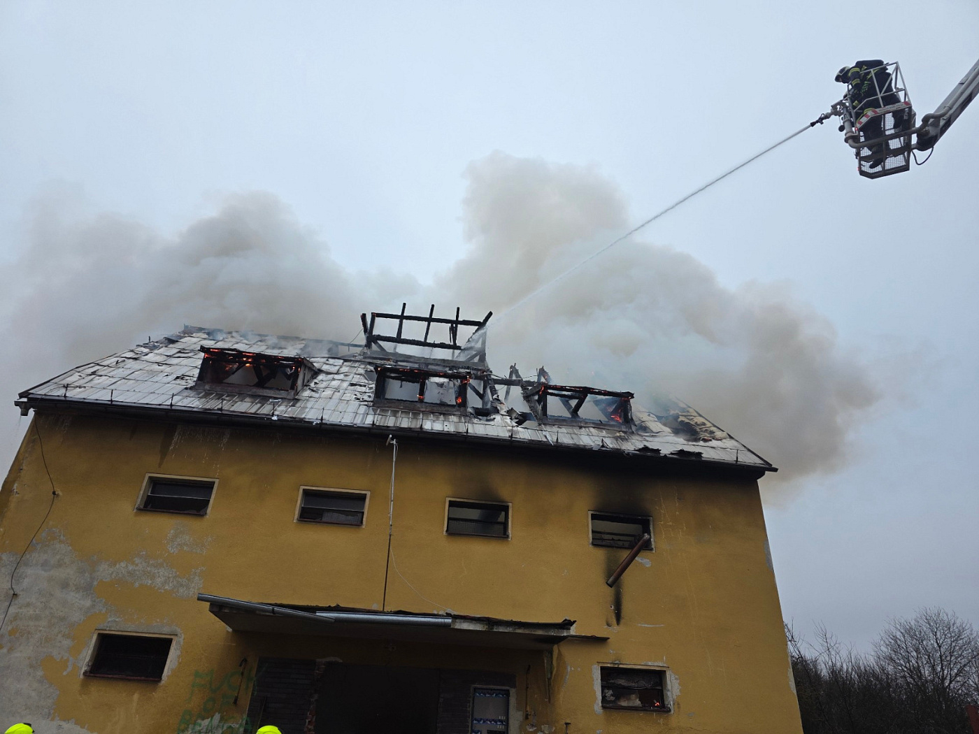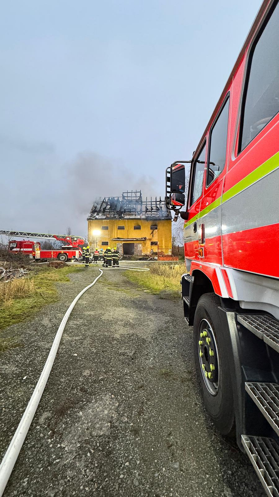 Krátce po půl třetí byla velitelem zásahu oznámena lokalizace požáru. Aktuálně pomocí výškové techniky hasiči rozebírají střešní konstrukci a hledají skrytá ohniska, která dohašují.
