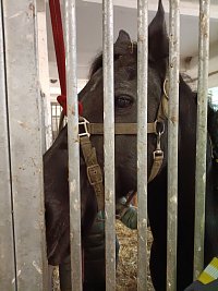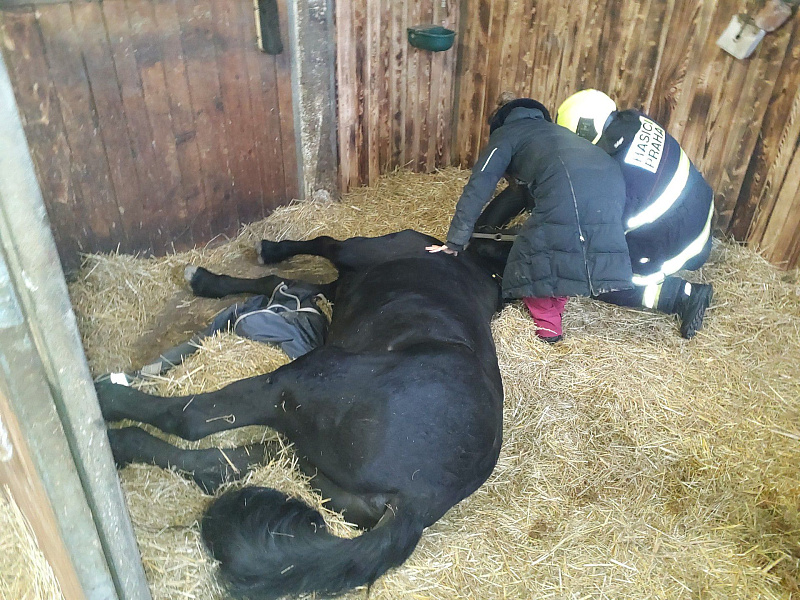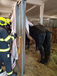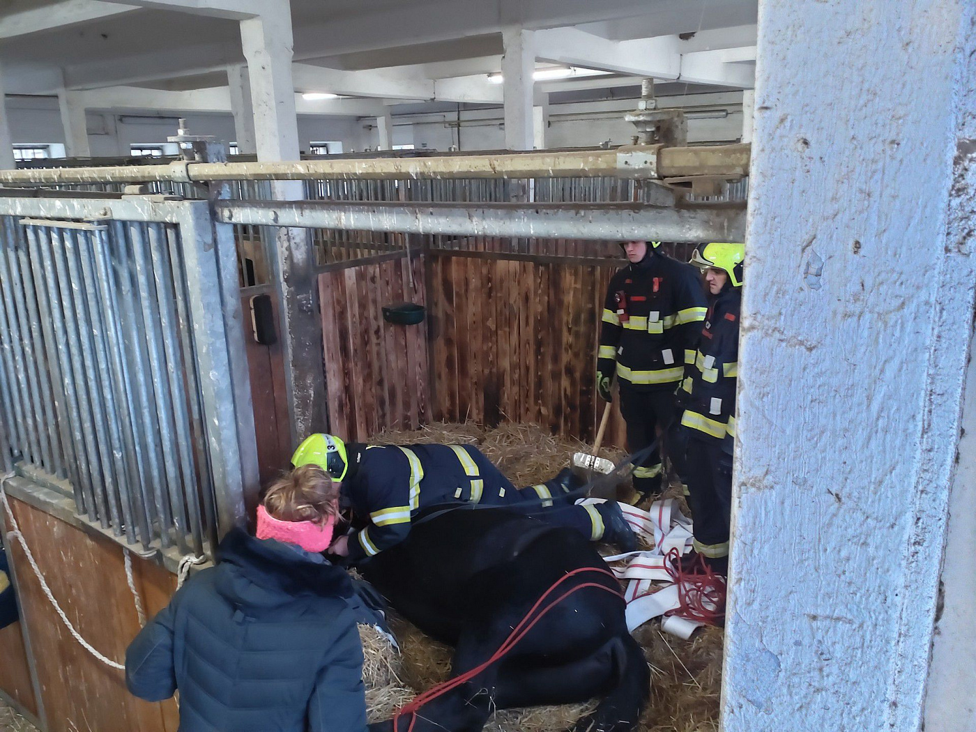 Jednotka hasičů z Holešovic zasahovala u vyproštění koně, který ležel na podlaze stáje a nebyl schopen se sám postavit. Zásah probíhal za asistence veterinárního lékaře a majitelky koně.