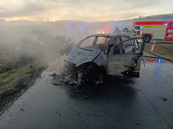 Po střetu dvou osobních vozidel u Chlumu začalo jedno z nich hořet