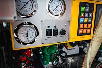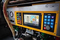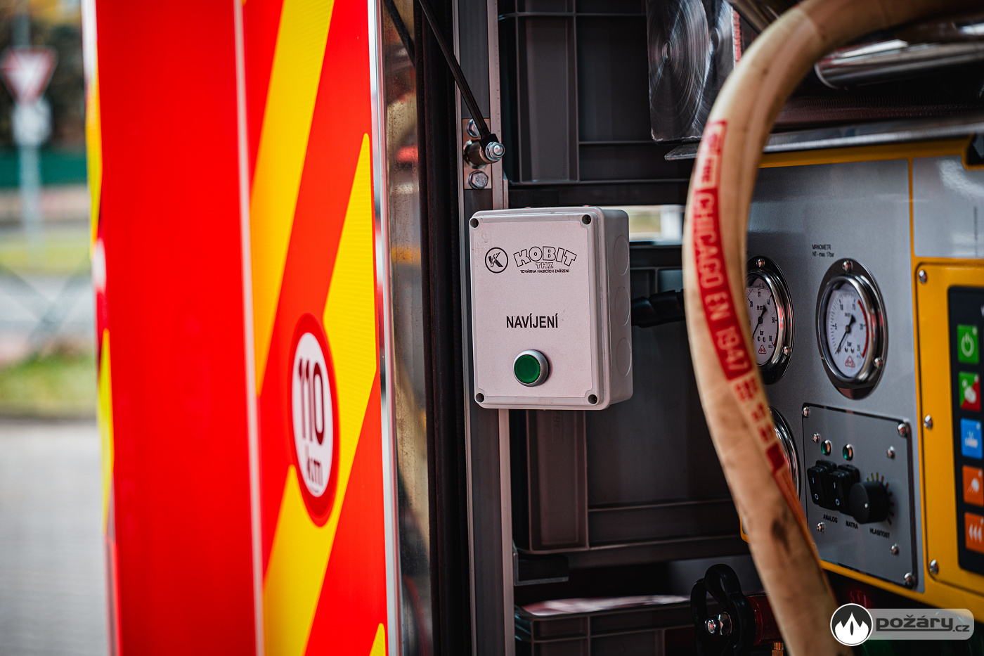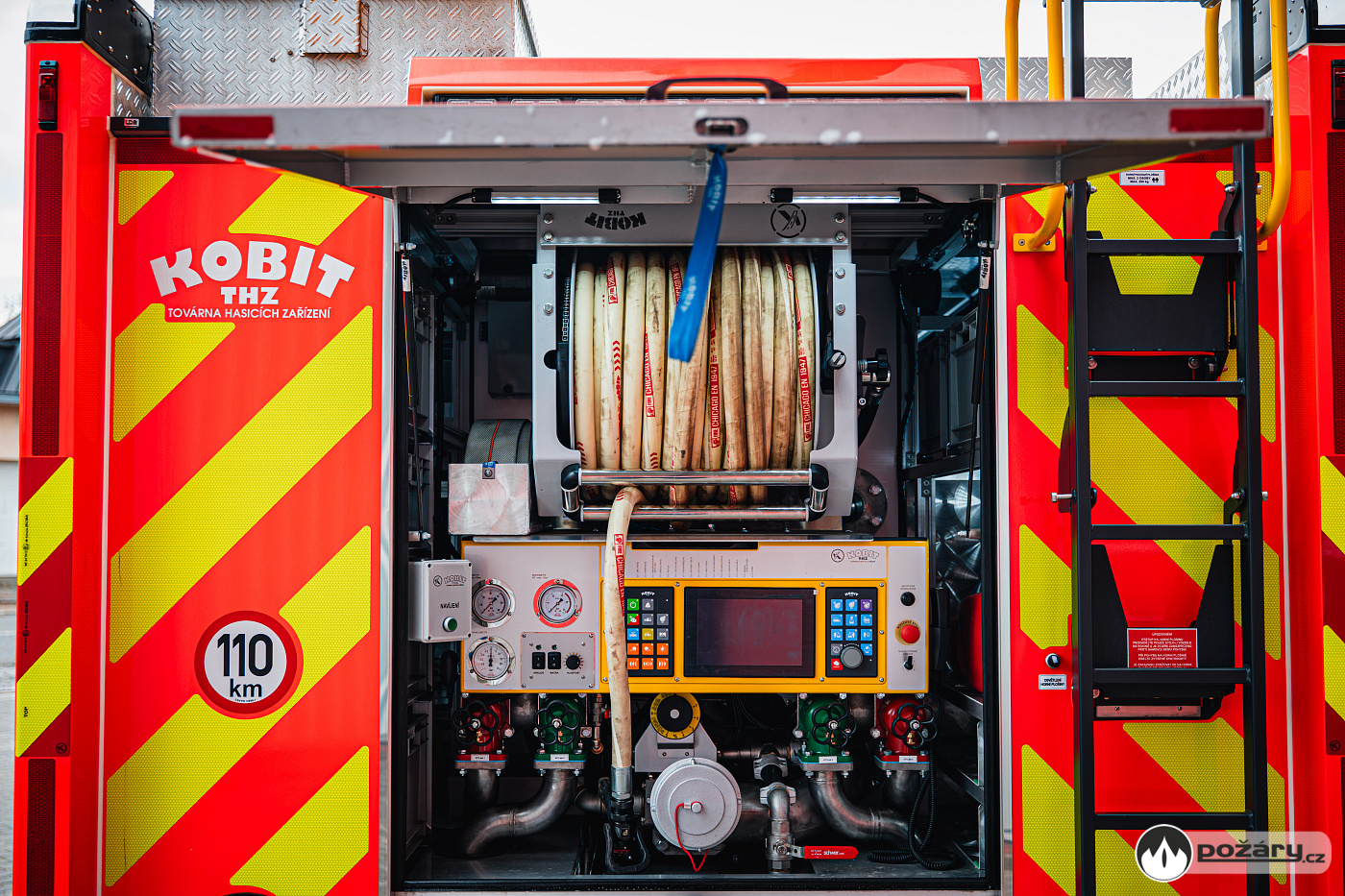 Naviják s vysokotlakou tvarově stálou hadicí je uchycen nad ovládacím panelem čerpadla v zadní části vozu.