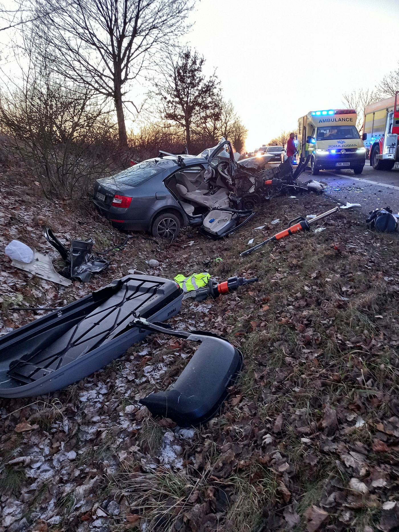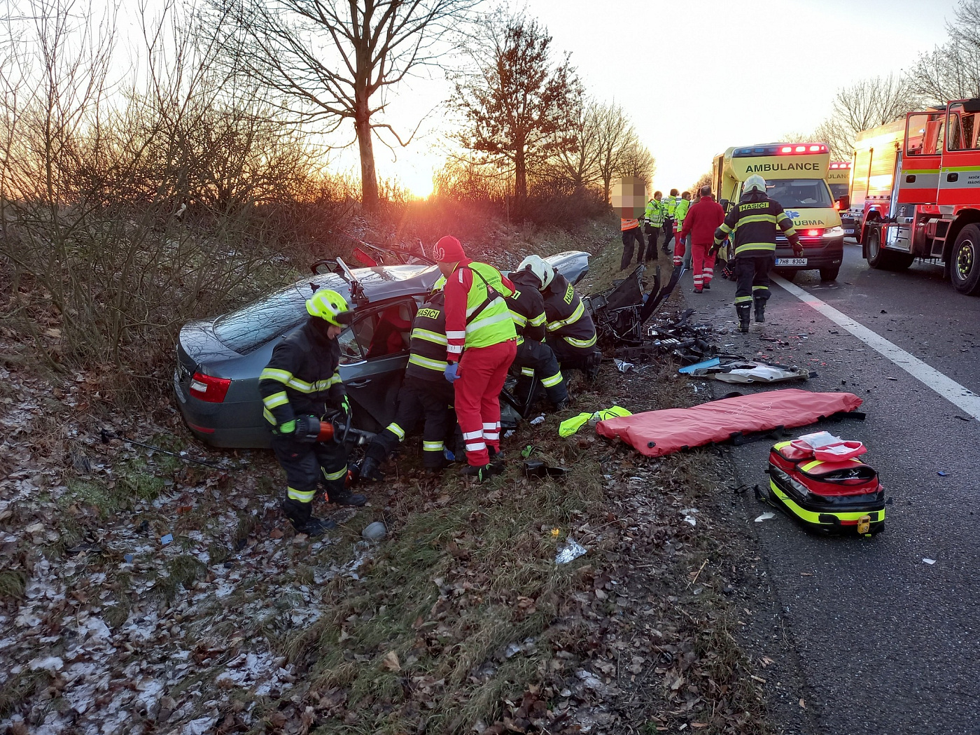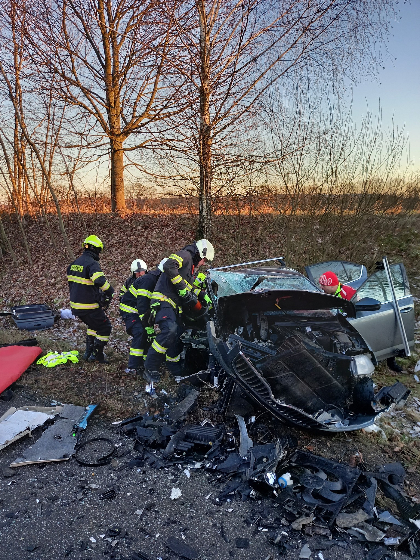 Při vážné dopravní nehodě tří vozidel u obce Úlibice se zranilo osm osob, jednu museli hasiči vyprostit