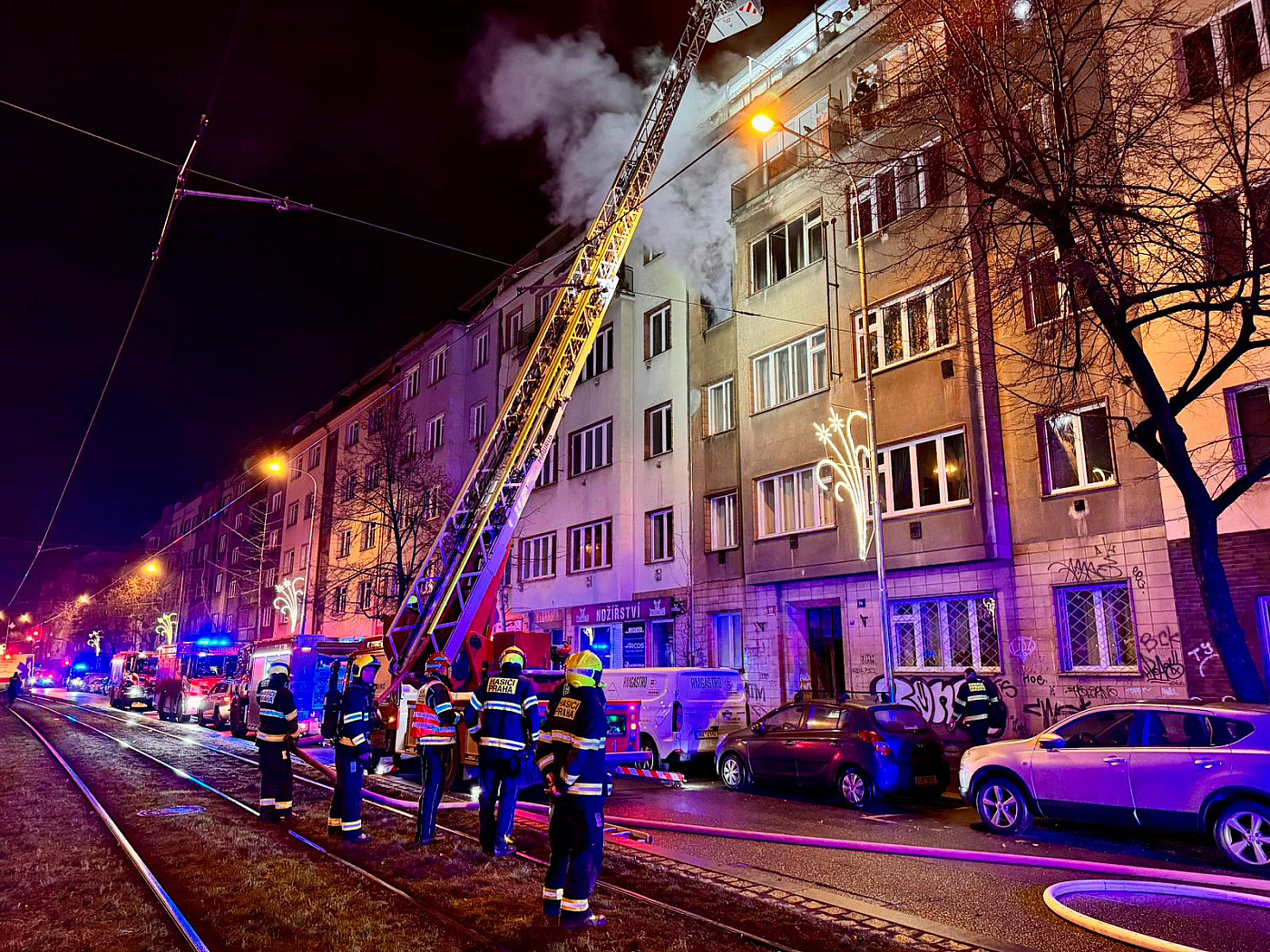 Druhý stupeň velitel v noci vyhlásil taky v pražských Vršovicích. Hasiči zachránili 2 osoby a předali je záchranářům. Evakuovali dalších 10 a tři psy.
