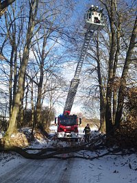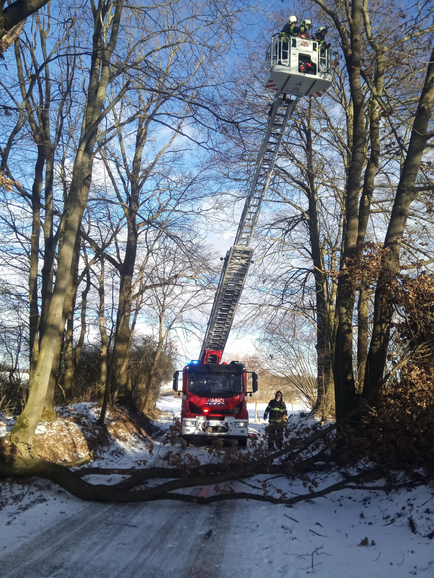 Větev z pětimetrové výšky odstranila Vrbenská profesionální jednotka a posádka automobilového žebříku z centrály České Budějovice nedaleko Ledenic-Zalin. Větev hasiči rozřezali, odklidili a provedli úklid komunikace.