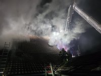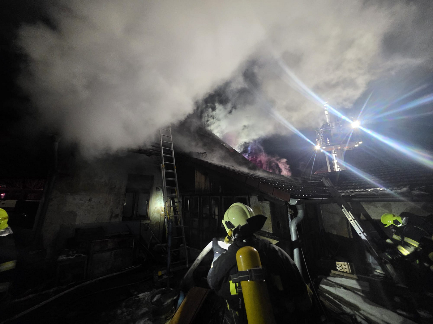 Po příjezdu na místo velitel hlásil, že je požárem zasaženo přízemí a první patro a požár se šíří na střechu. Hasiči zasahovali v dýchací technice z vnitřku i vnějšku budovy za pomoci automobilové plošiny. Z objektu hasiči vynesli dvě 10kg propanbutanové lahve. Ty nebyly požárem zasaženy.