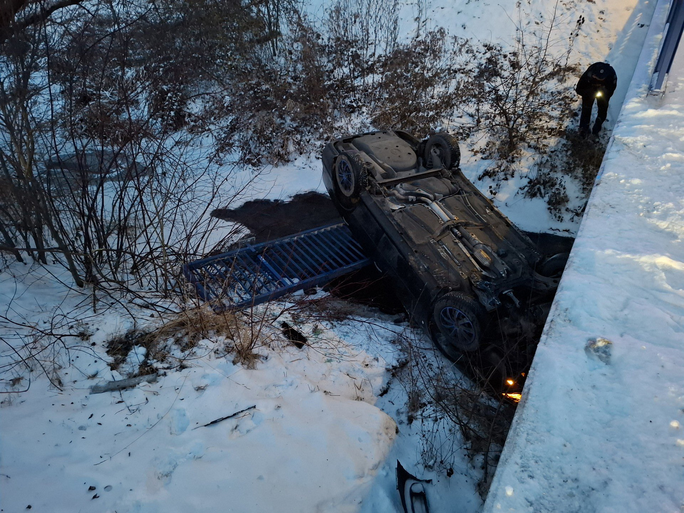 V souvislosti s počasím řeší olomoučtí hasiči nehodu v Újezdu, kde narazilo osobní vozidlo do zábradlí na mostě, zřítilo se do vodního toku a převrátilo se na střechu. Zraněny byly dvě osoby, kterým hasiči poskytli první pomoc a předali je záchranářům.