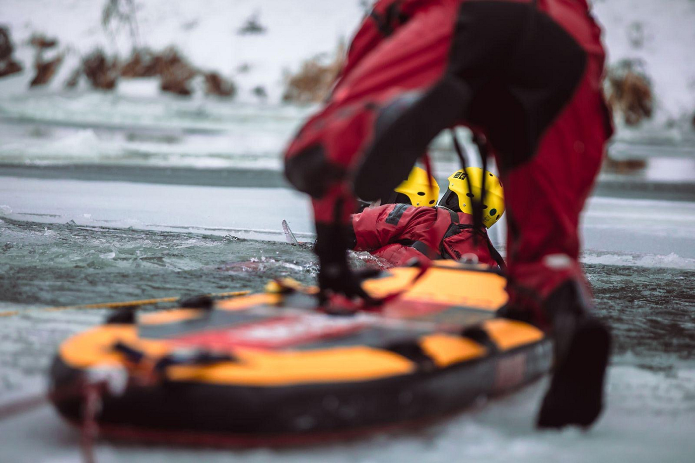 Pokud se člověk propadne do ledové vody, je zásadní zachovat klid. První minuty rozhodují. Otočit se směrem, odkud jsme přišli, pomalu se vytáhnout na led a po ploše se odplazit do bezpečí. Postavit se je velmi rizikové, položením se na led rozložíme váhu těla po ledové ploše.