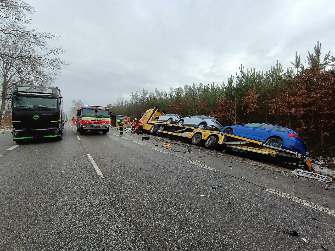 S uzavřenou silnicí I/20 počítejte u Pamětic. Probíhají zde likvidační práce po nehodě dvou nákladních a osobního auta. U nehody zasahují všechny složky IZS, z hasičů profesionální jednotka z Písku a JSDHO Pamětice. ZZS ošetřovala dvě zraněné osoby, nehoda je bez vyproštění.