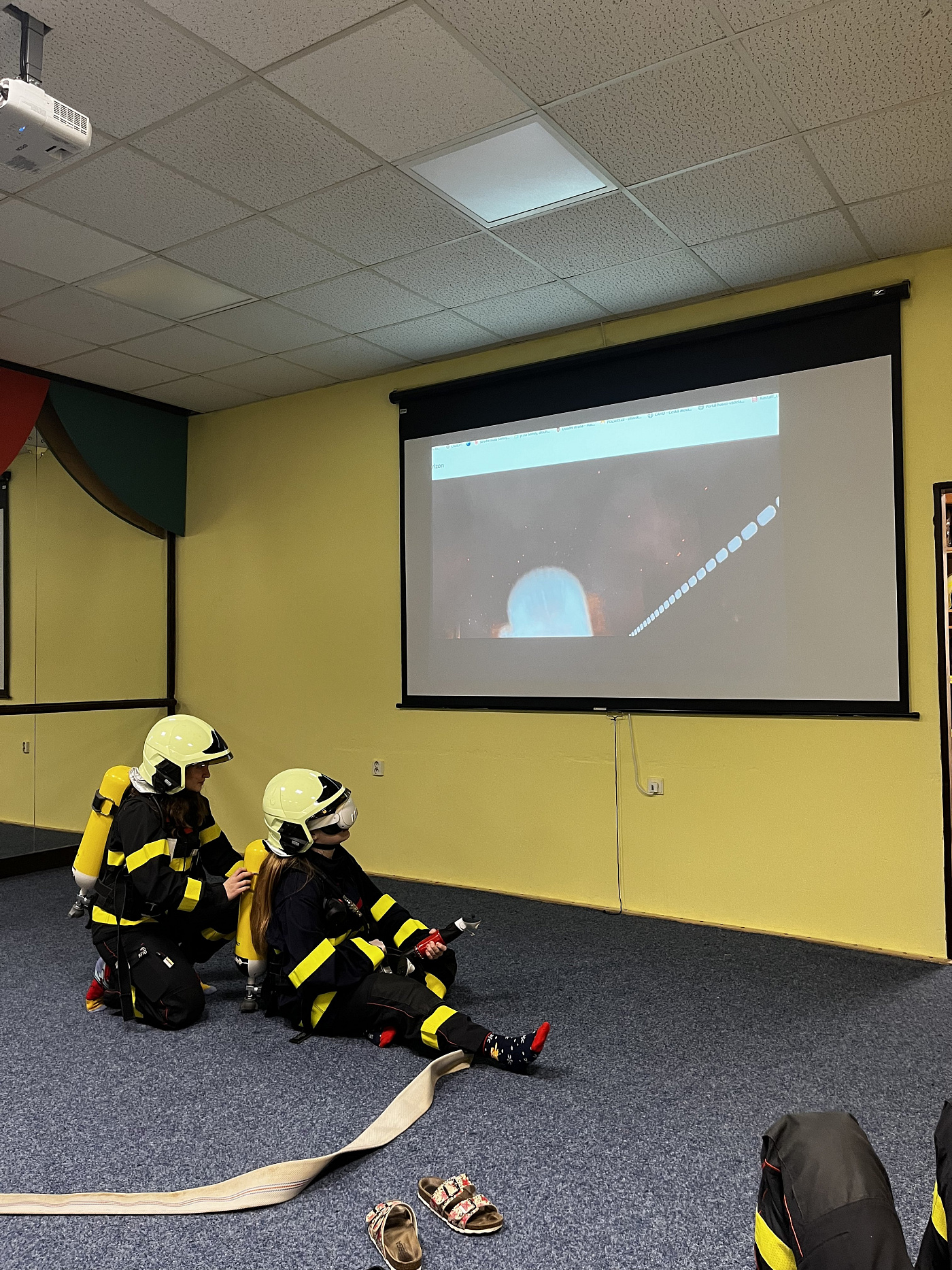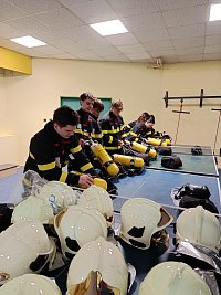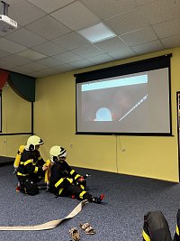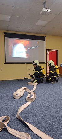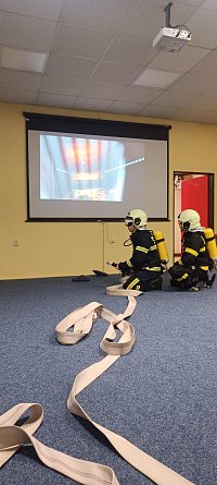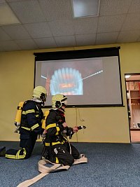 Po úspěšném zvládnutí teorie následovala část praktická, ve které se žáci seznámili s jednotlivými částmi dýchacího přístroje a zopakovali si základní postupy práce s proudnicí v uzavřeném prostoru pomocí virtuální reality.
