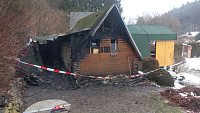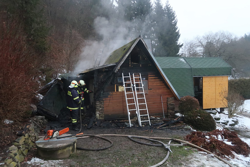 K požáru chaty v obci Sedlec hasiči z důvodu ledovky nedojeli, museli natáhnout dopravní vedení