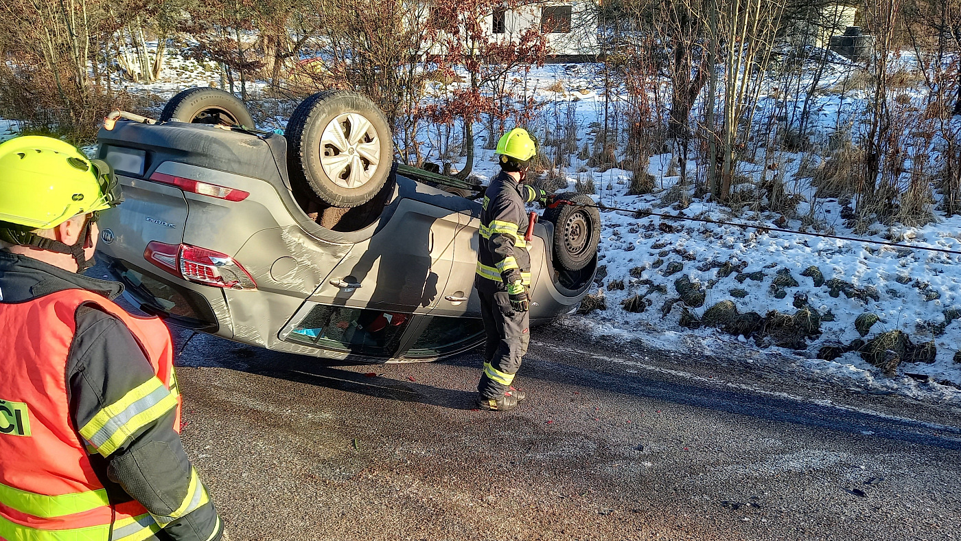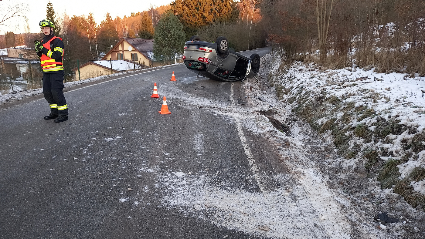 Profesionální hasiči z centrální hasičské stanice Velké Poříčí zasahují v obci Hronov na Náchodsku u dopravní nehody osobního vozidla.