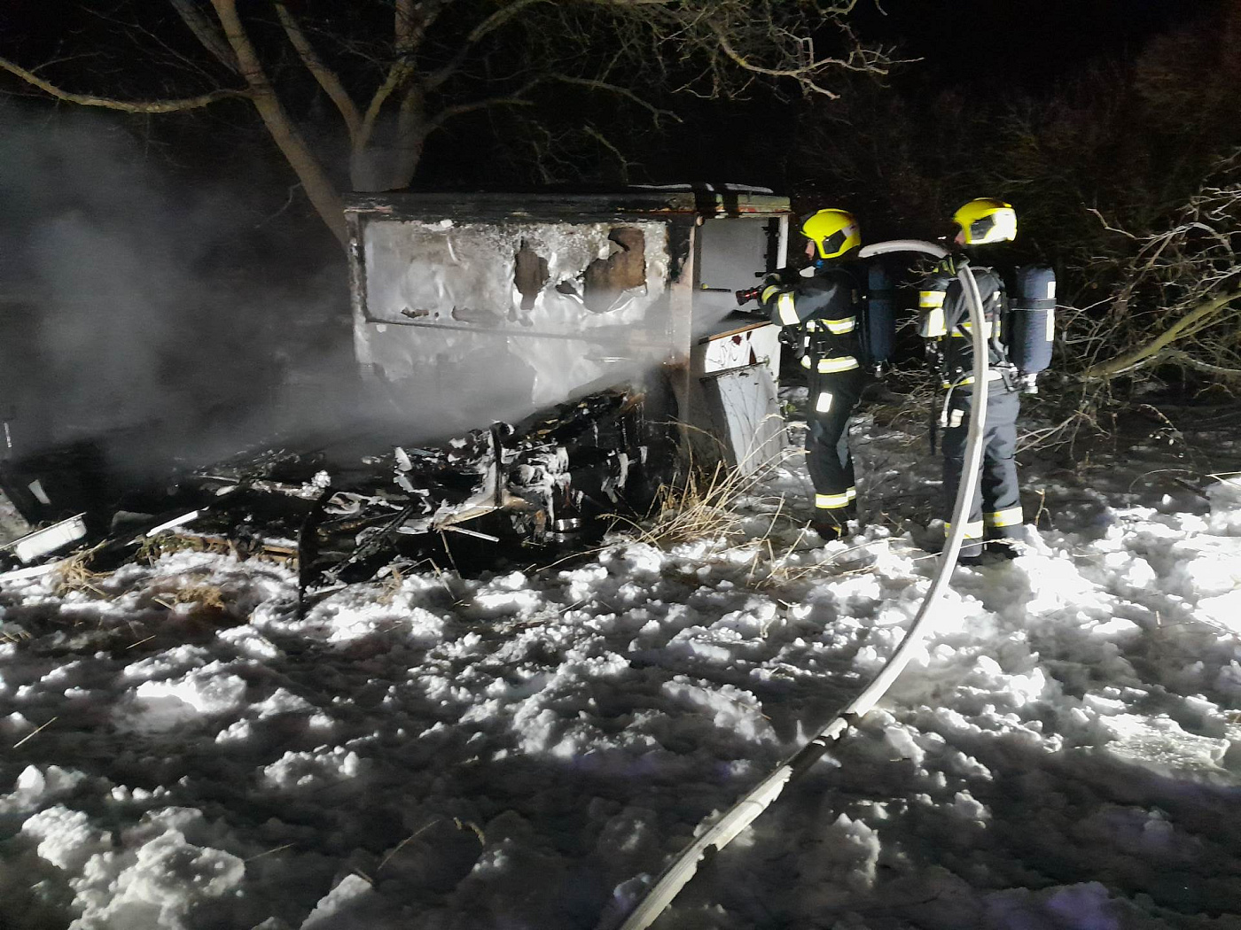 Požár dvou obytných karavanů zlikvidovali hasiči v Lomu na Mostecku. K likvidaci požáru hasiči nasadili vodní proudy. V jednom karavanu byla nalezena již vyhořelá tlaková nádoba na plyn, hasiči ji vynesli do zahrady a dále ochlazovali.