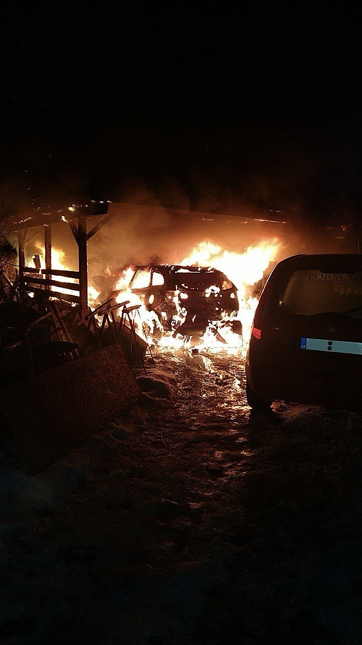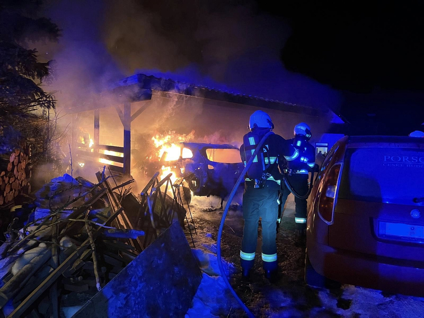 Dnes před 3:00 zasahovaly u požáru auta a přístřešku v Křenově na Českokrumlovsku profesionální jednotka z Českého Krumlova a dobrovolná jednotka Chvalšiny. Škoda se patrně vyšplhá na cca. 400 000,– Kč, příčina požáru je v šetření.