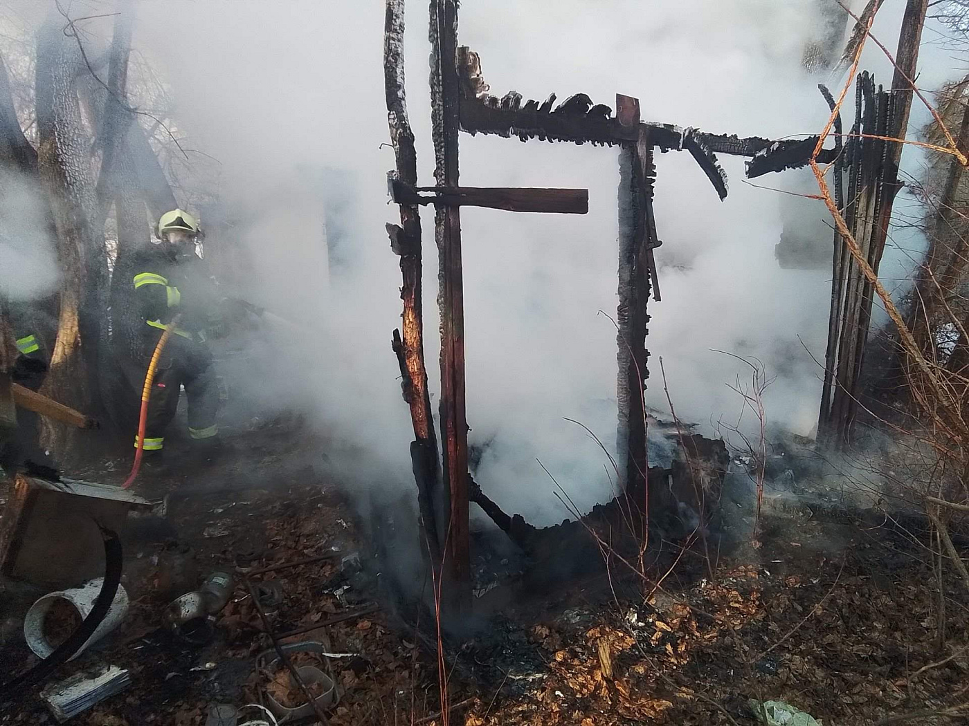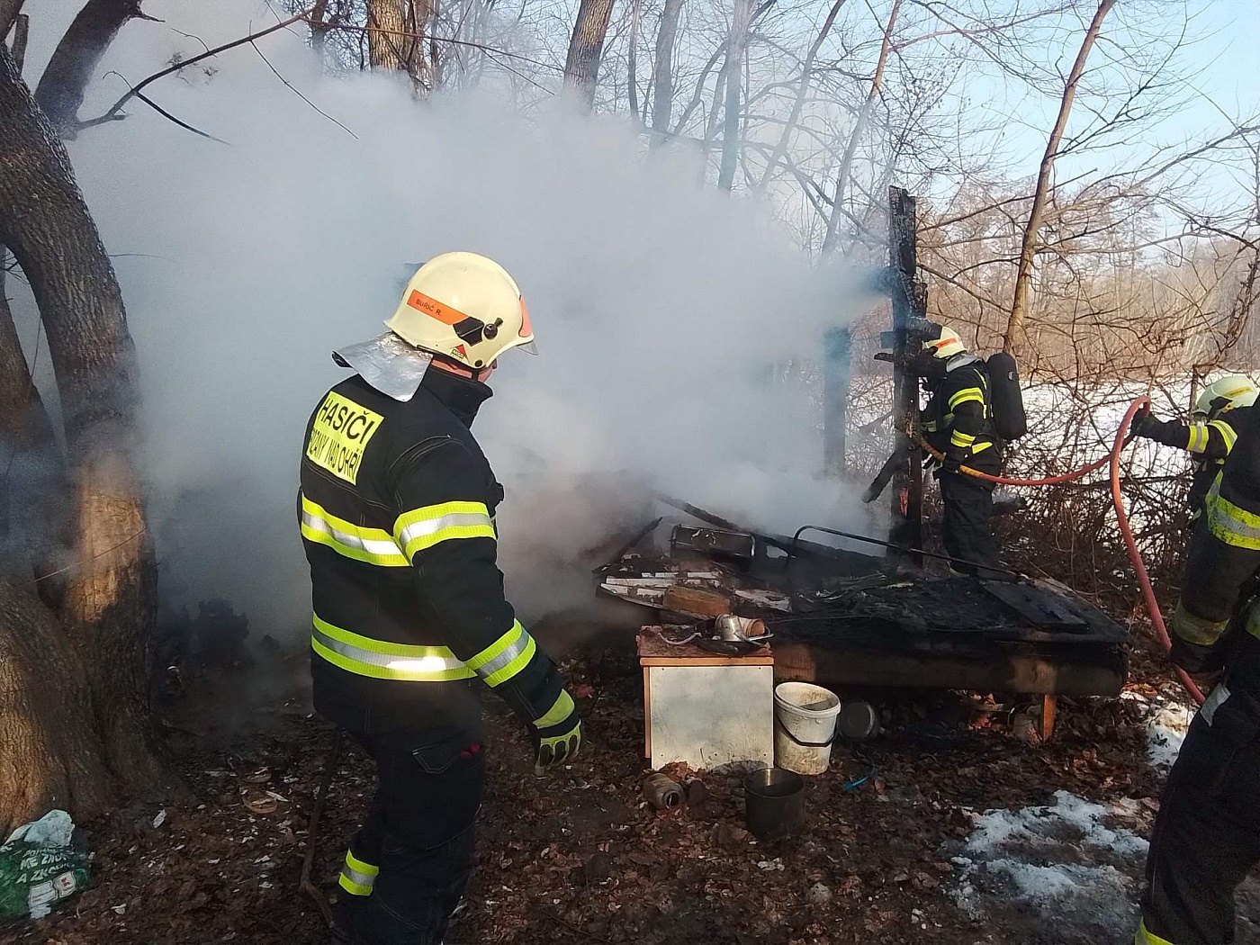 Požár dřevěné chatky v Brozanech nad Ohří likvidují hasiči pomocí vysokotlakého vodního proudu. Zasahují čtyři jednotky požární ochrany.