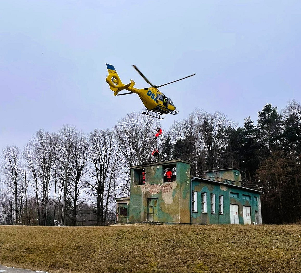 Tento týden ve čtvrtek a pátek proběhl výcvik u českobudějovického letiště společně s kolegy z Letecké záchranné služby Jihočeského kraje. Již tradičně využili objekt bývalé trafostanice k nácviku záchrany osob pomocí vrtulníku EC 135 T2+ s imatrikulací OK-JIX, který provozuje společnost DSA, a. s.